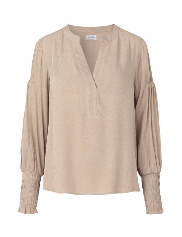 Deze prachtige blouse is een must-have in je garderobe! Ze heeft een v-hals en lange mouwen met elastische manchetten. De blouse heeft een subtiele jacquard stippenprint. Draag haar met de bijpassende rok, een stoere riem en een laarsje en you’re ready to go!