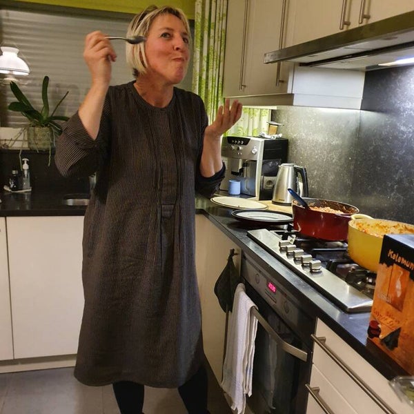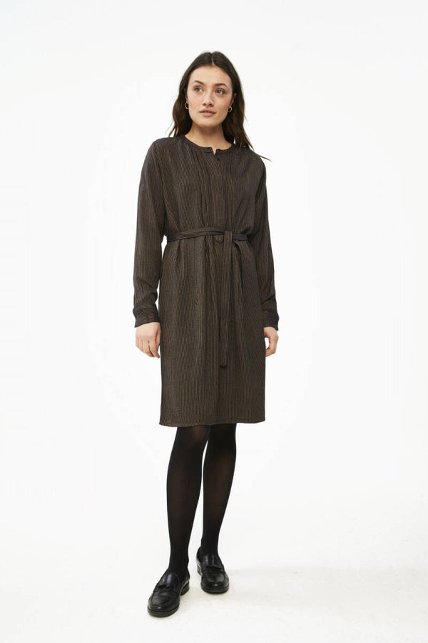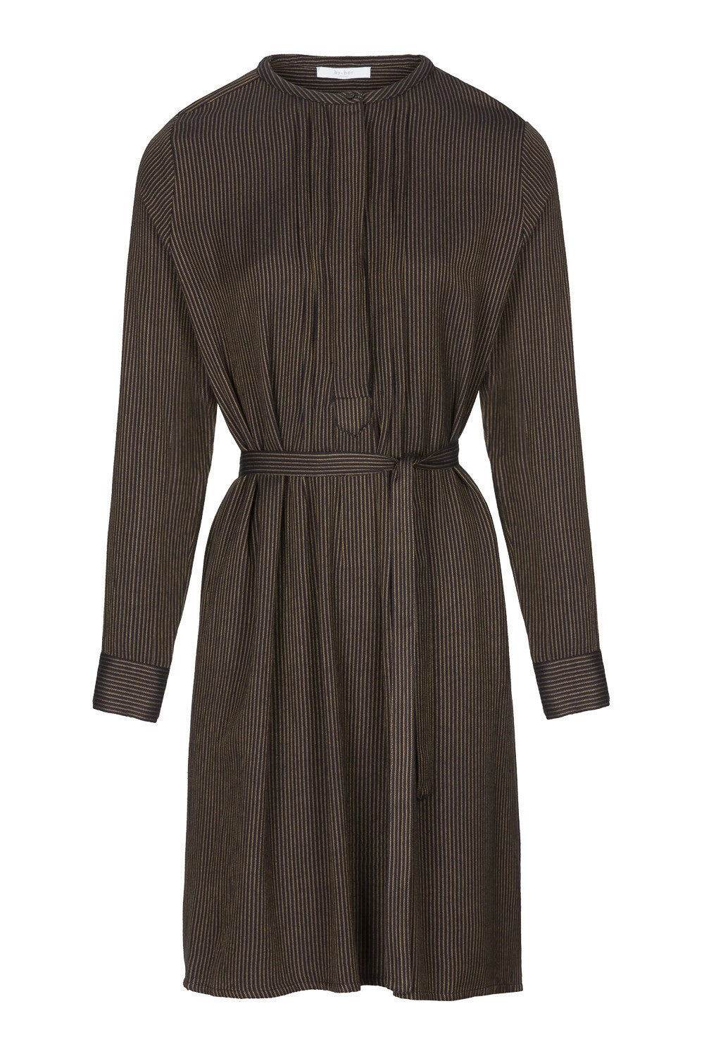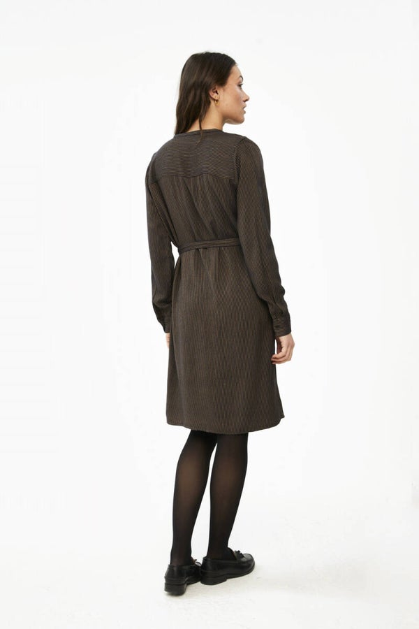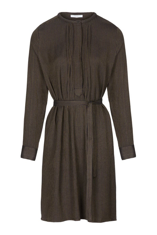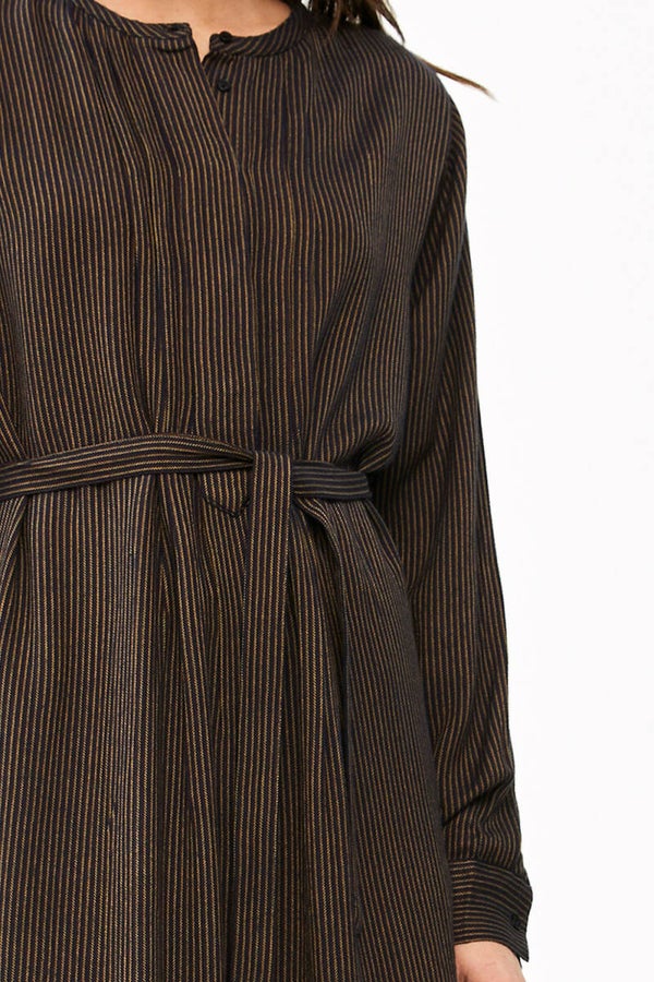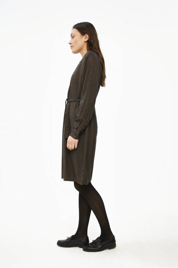 Deze jurk is gemaakt van een superzachte katoenblend. De jurk heeft een gestreept dessin en is te dragen met of zonder ceintuur. Ook heeft de dress een verborgen knoopsluiting op de voorzijde. Hierbij is gewerkt met plooitjes, wat de jurk een speels effect geeft. Daarnaast zijn de mouwen ook voorzien van een knoopsluiting en kleine split.