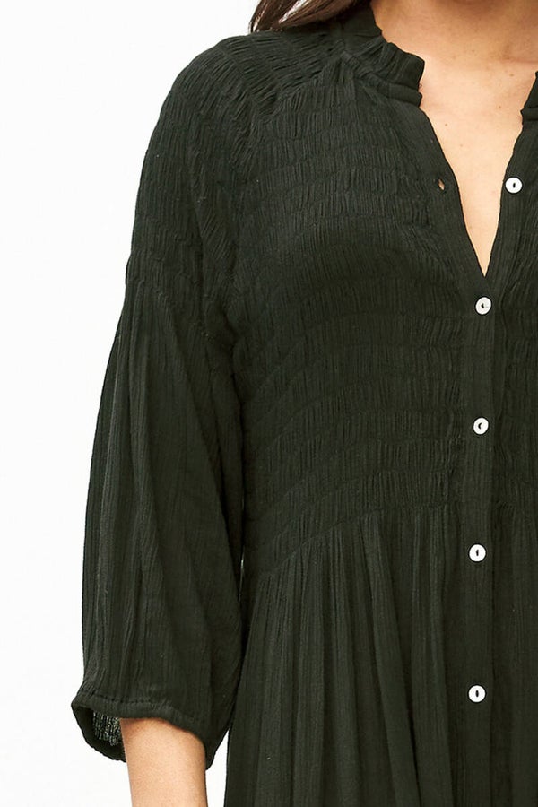 Deze pracjhtige jurk is nu al een van onze favorieten. Hij is gemaakt van een rijke blend van viscose en katoen. Dit zorgt ervoor dat de jurk heel zacht en luchtig aanvoelt en ideaal is voor deze tijd van het jaar. De voor- en achterkant van deze jurk heeft een prachtig smockwerk. De voorkant van de jurk is voorzien van een knoopsluiting tot halverwege. De jurk heeft een ronde halslijn met een klein geplooid boordje. De jurk heeft een driekwart mouw voorzien van een elastieken boord dit zorgt voor een blousend effect. Verder heeft de jurk aan de onderkant een split.