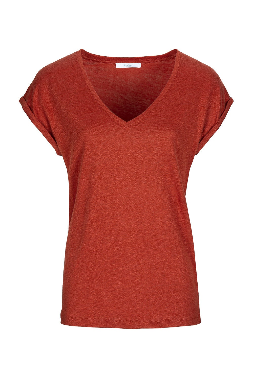 Deze t-shirt is vervaardigd uit een mooie kwaliteit linnen. De top heeft een kleine kapmouw, is licht gemêleerd en is voorzien van een vrouwelijke doch sportieve v-halslijn.