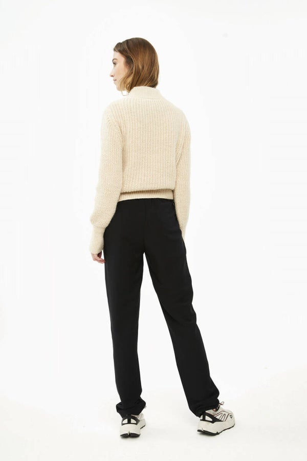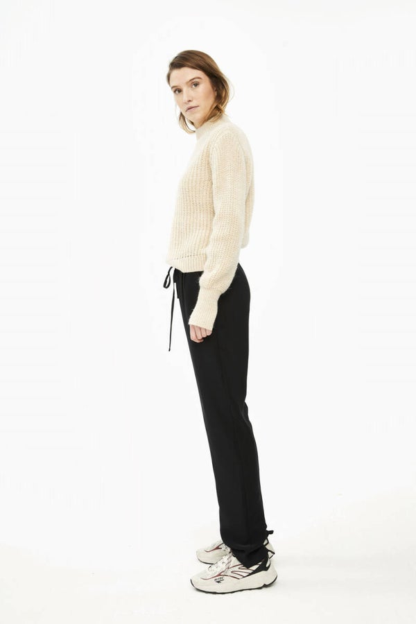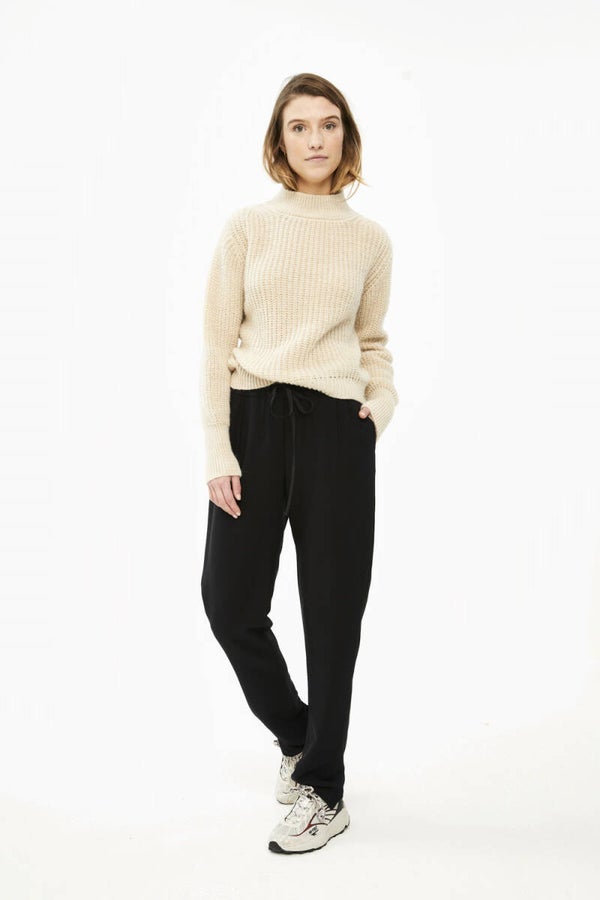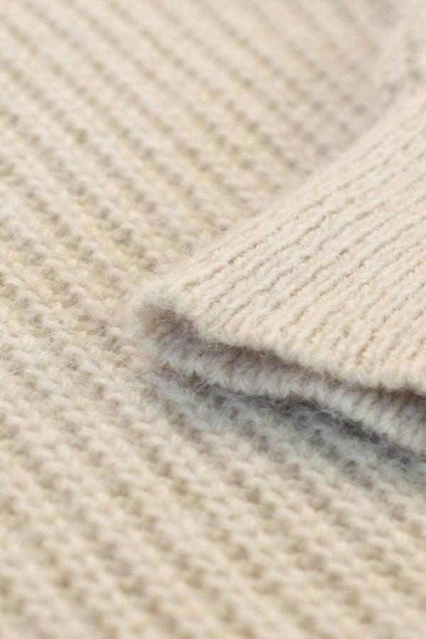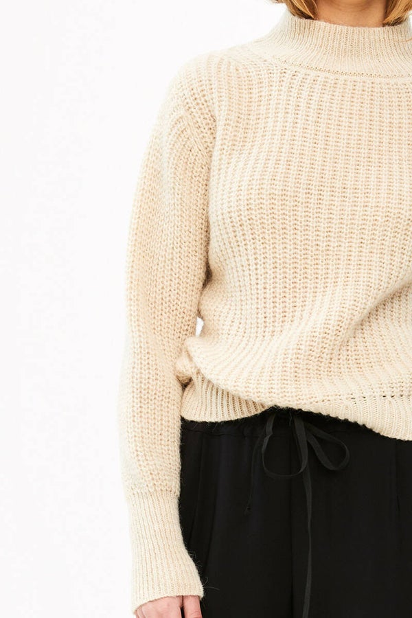 Deze trui is gemaakt van een luxe wolblend, met onder andere alpaca wol. Dit zorgt voor een optimaal draagcomfort. De gebreide trui heeft lange mouwen en een opstaande kraag. De mouwen zitten aansluitend aan de polsen waardoor er een licht balloneffect ontstaat.