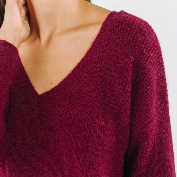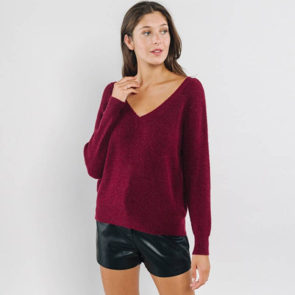 Dit bordeaux truitje heeft zowel voor- als achteraan een v-hals, waardoor het truitje een sexy look krijgt.