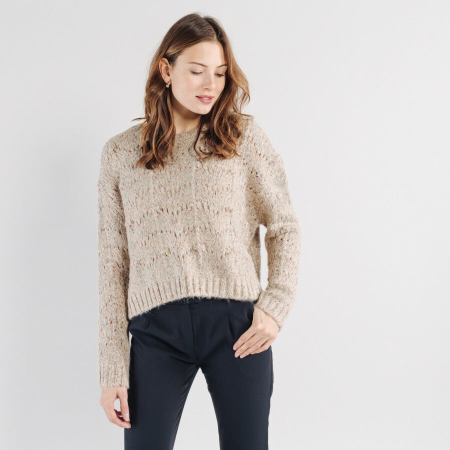 We houden van de details van deze gespikkelde gebreide trui. De geribbelde randen bij de kraag en taille geven structuur aan dit cocooning-stuk. • Ronde kraag. • Lange mouwen. • Opengewerkte mesh. • Groot gaas. Samenstelling: 68% polyester, 24% polyamide, 4% polyamide, 4% wol.