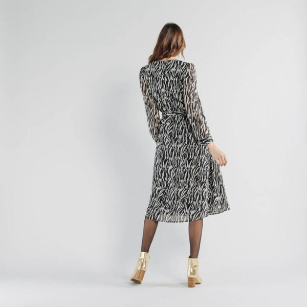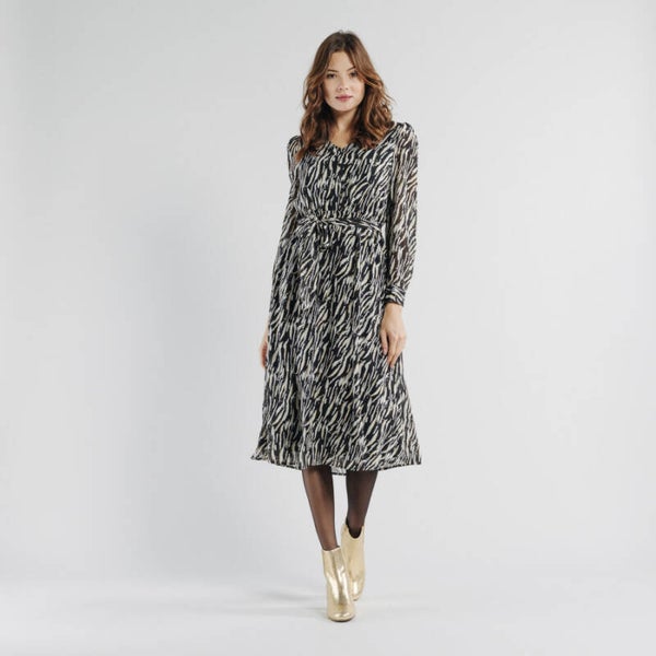 Deze prachtige klassieke jurk is perfect voor iedereen en de zebraprint geeft deze jurk een vleugje waanzin. De taille is geaccentueerd door een riempje. • v-hals • Lange mouwen • gouden details op de print. • Afneembare riem. Samenstelling: 100% polyester.