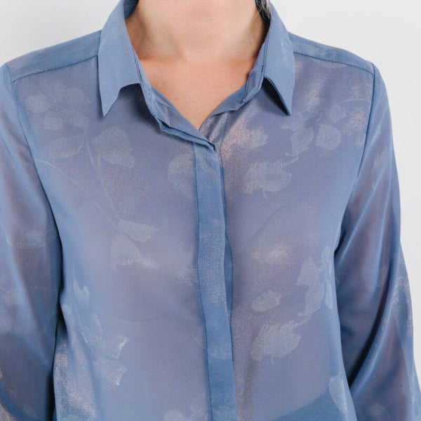 • Transparant overhemd. • Glanzend materiaal. • Verborgen knopen. • Kraag.