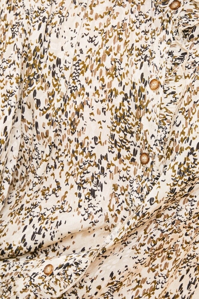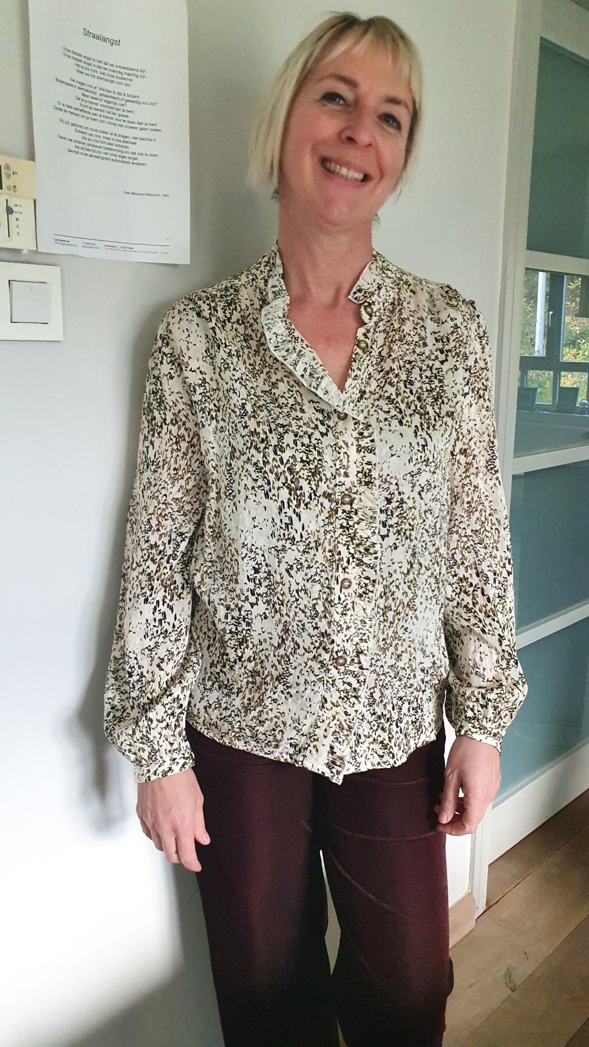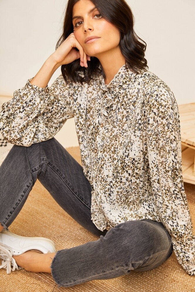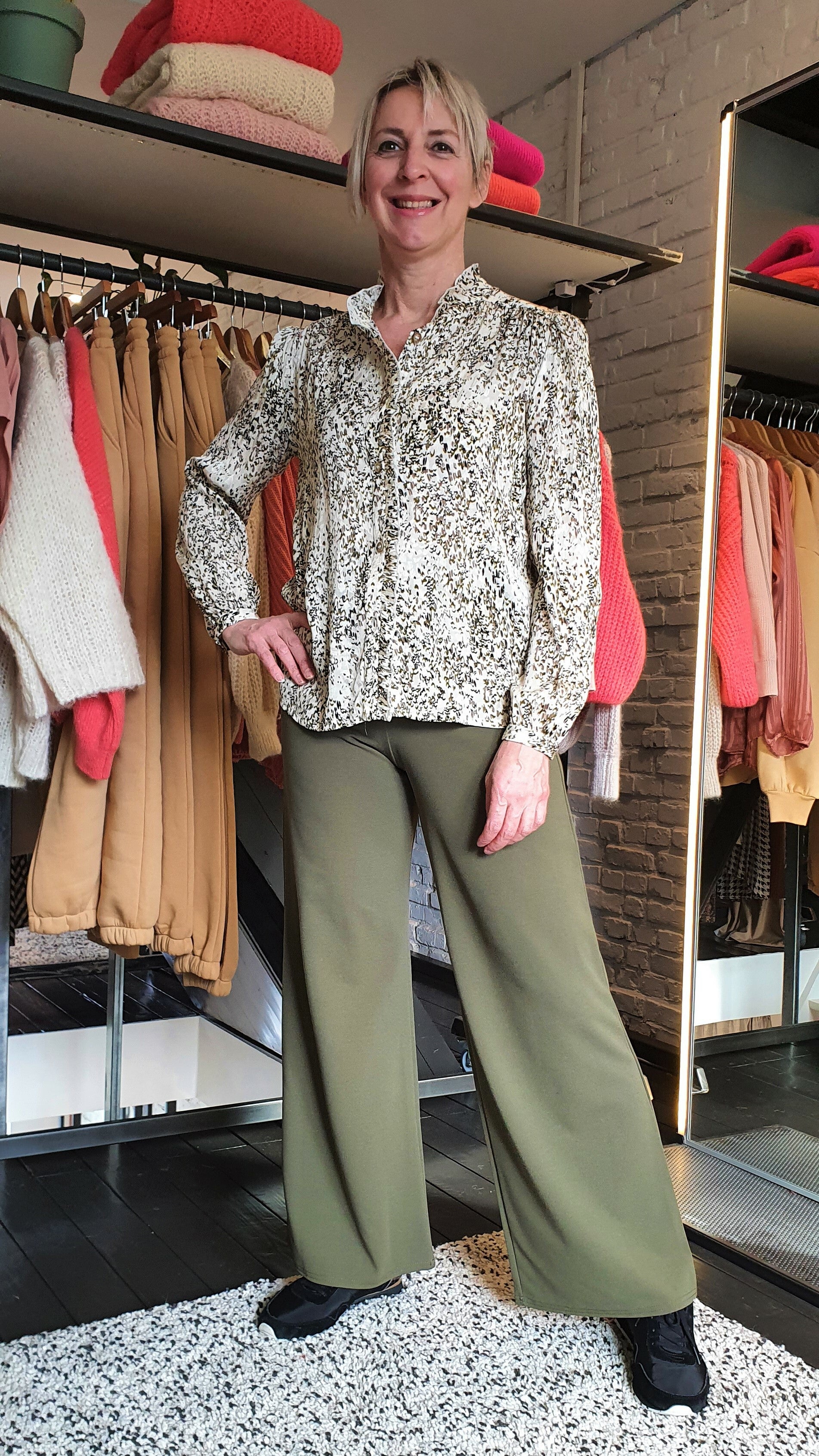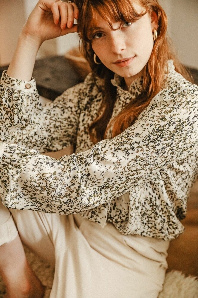 Blouse met lange mouwen aan de manchetten, open V-hals, knoopsluiting aan de voorzijde met gemarmerde knopen, ruches aan de kraag en knoopsluiting. Aangenaam vloeiende stof. Bedekt met een patroon in sobere kleuren. Een mooie blouse om gemakkelijk te combineren met allerlei soorten broeken voor een elegante look in alle omstandigheden!