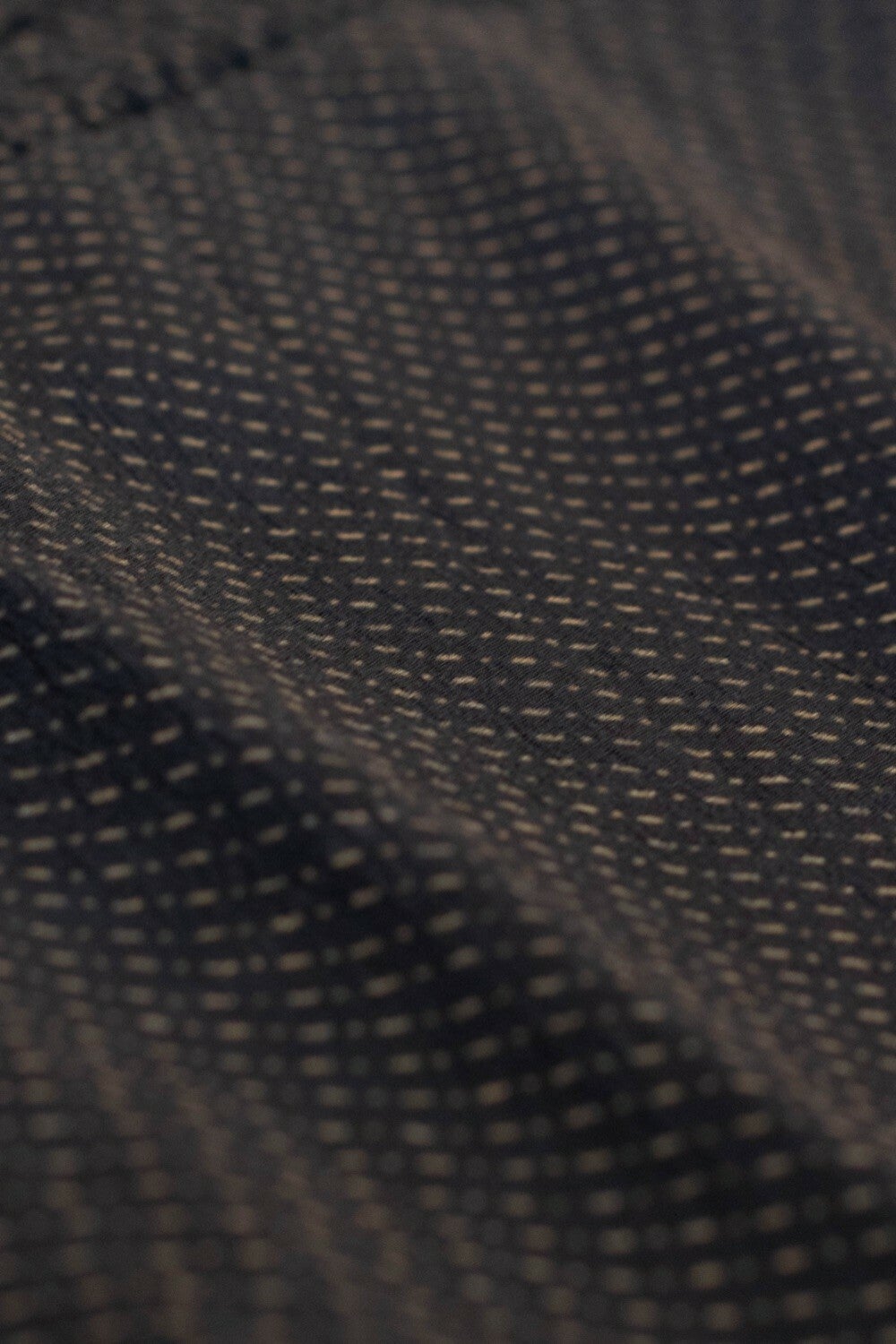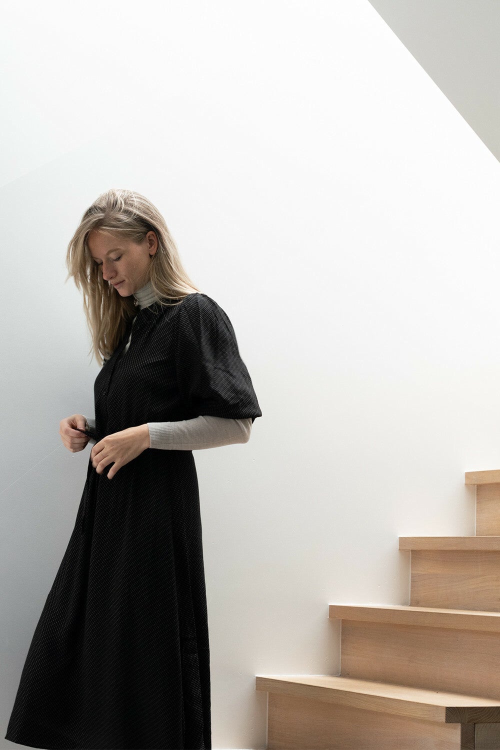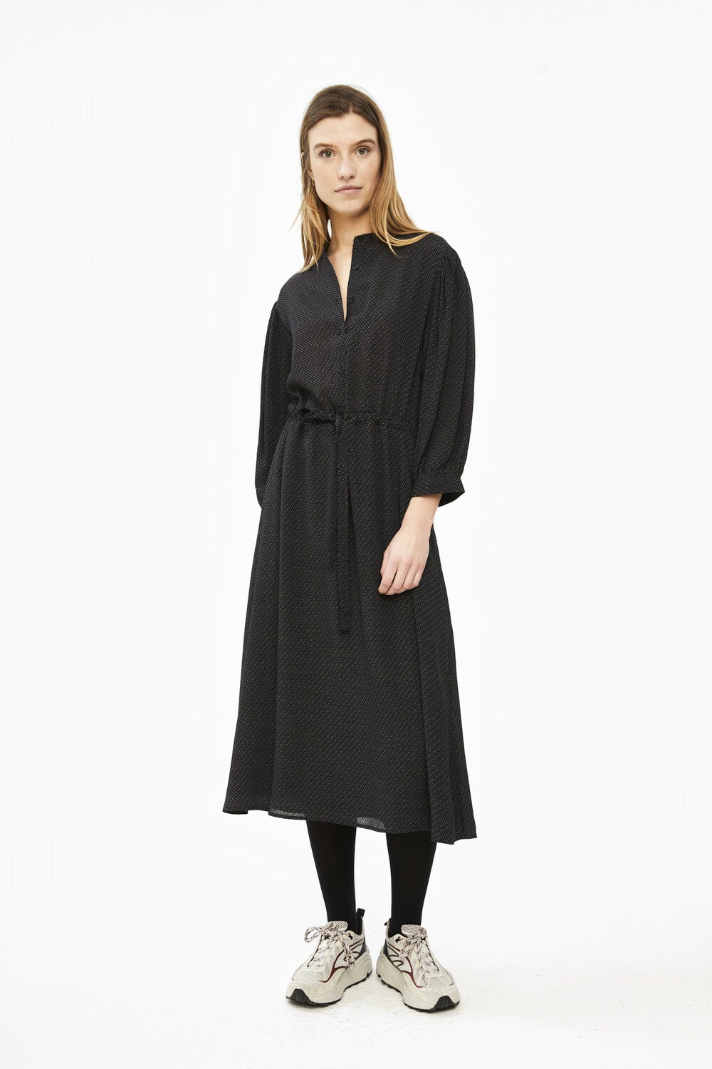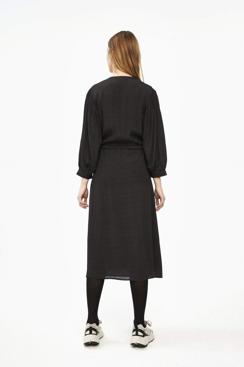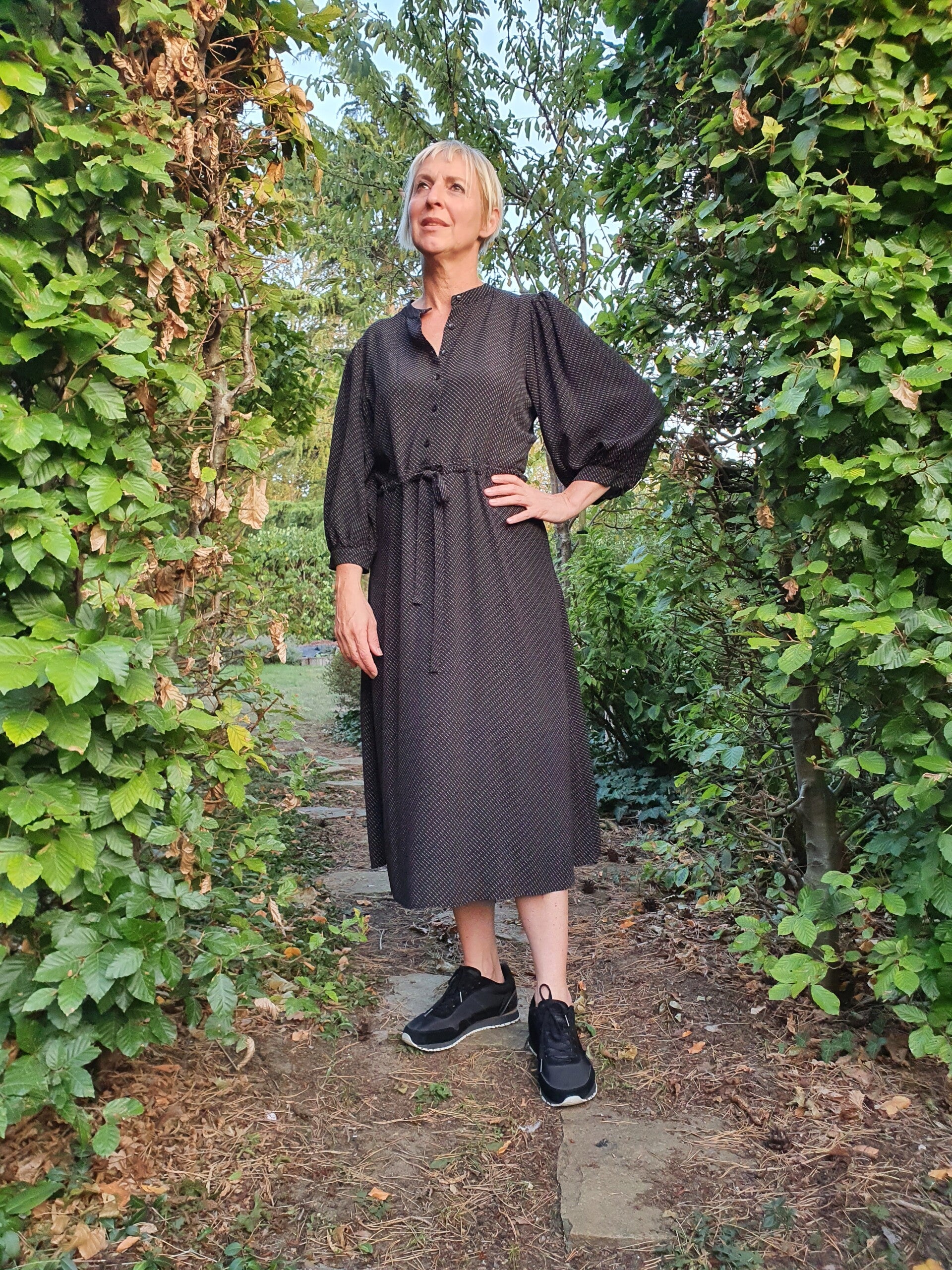zwarte jurk met 3/4 mouwen en klein beige motiefje