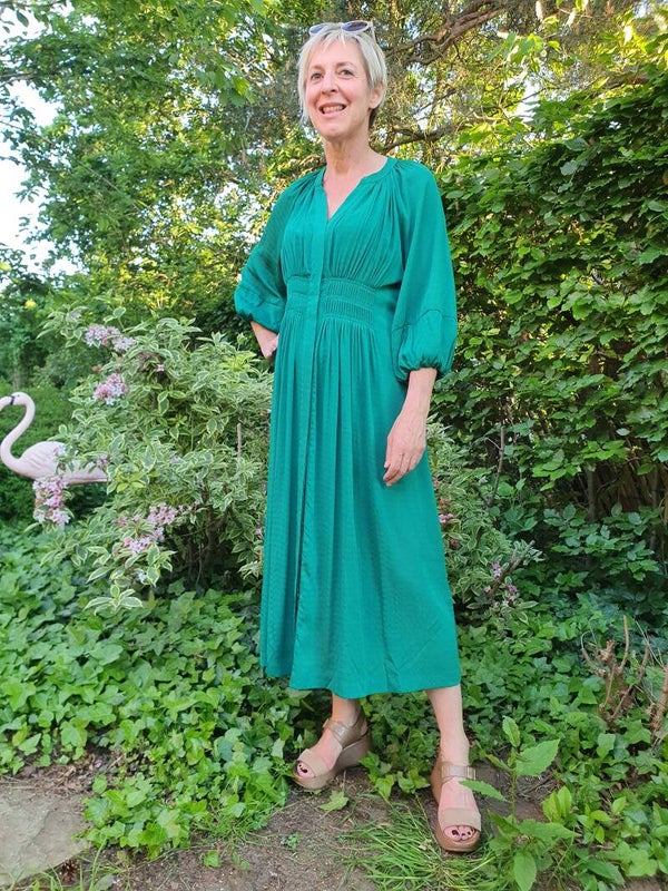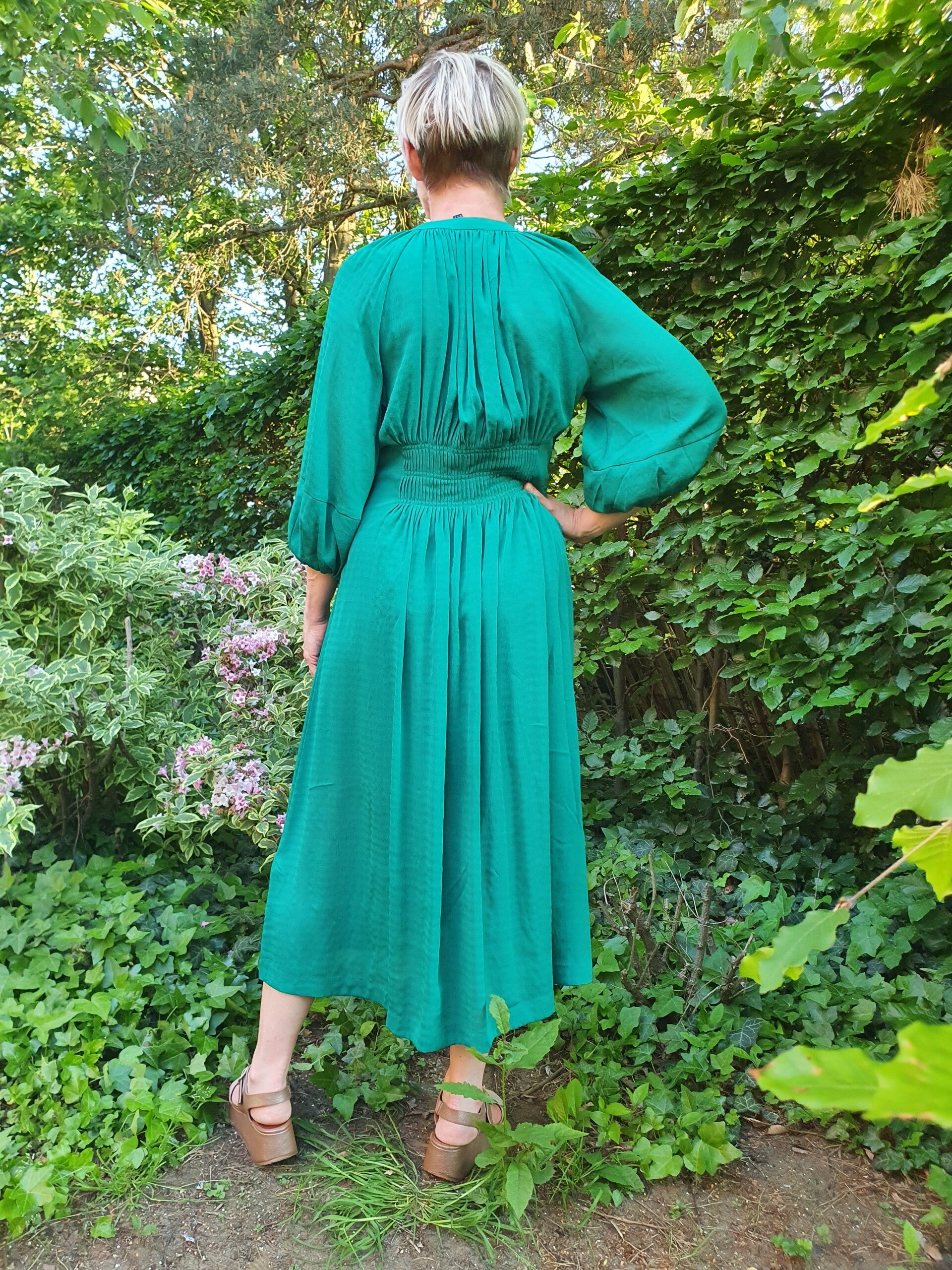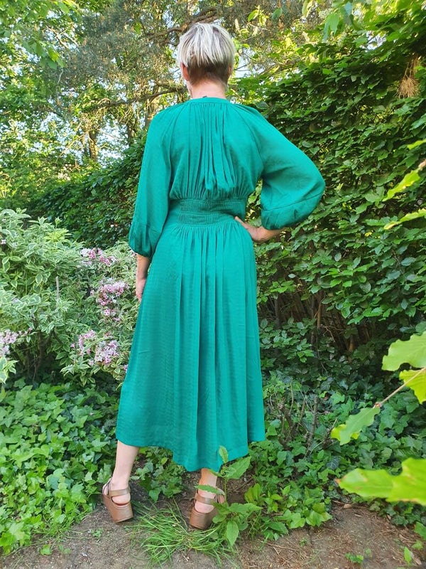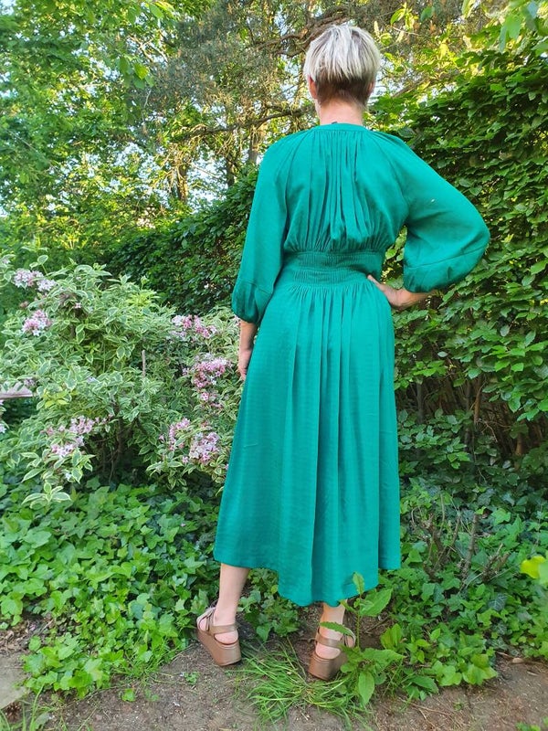 Deze prachtige groene jurk geeft onmiddellijk karakter aan je garderobe. Deze eye-catcher heeft een ontspannen silhouet en is zeer comfy om te dragen. De jurk heeft 3/4 mouwen en een bijpassende groene onderjurk