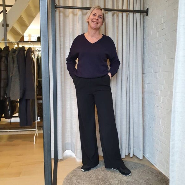 Deze mooie navy-blauwe trui met V-hals is superzacht en een ideaal basisstuk voor je garderobe. Combineert mooi bij broek of rok.