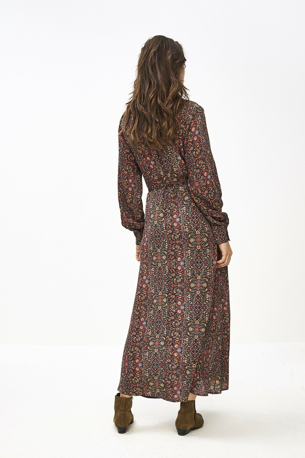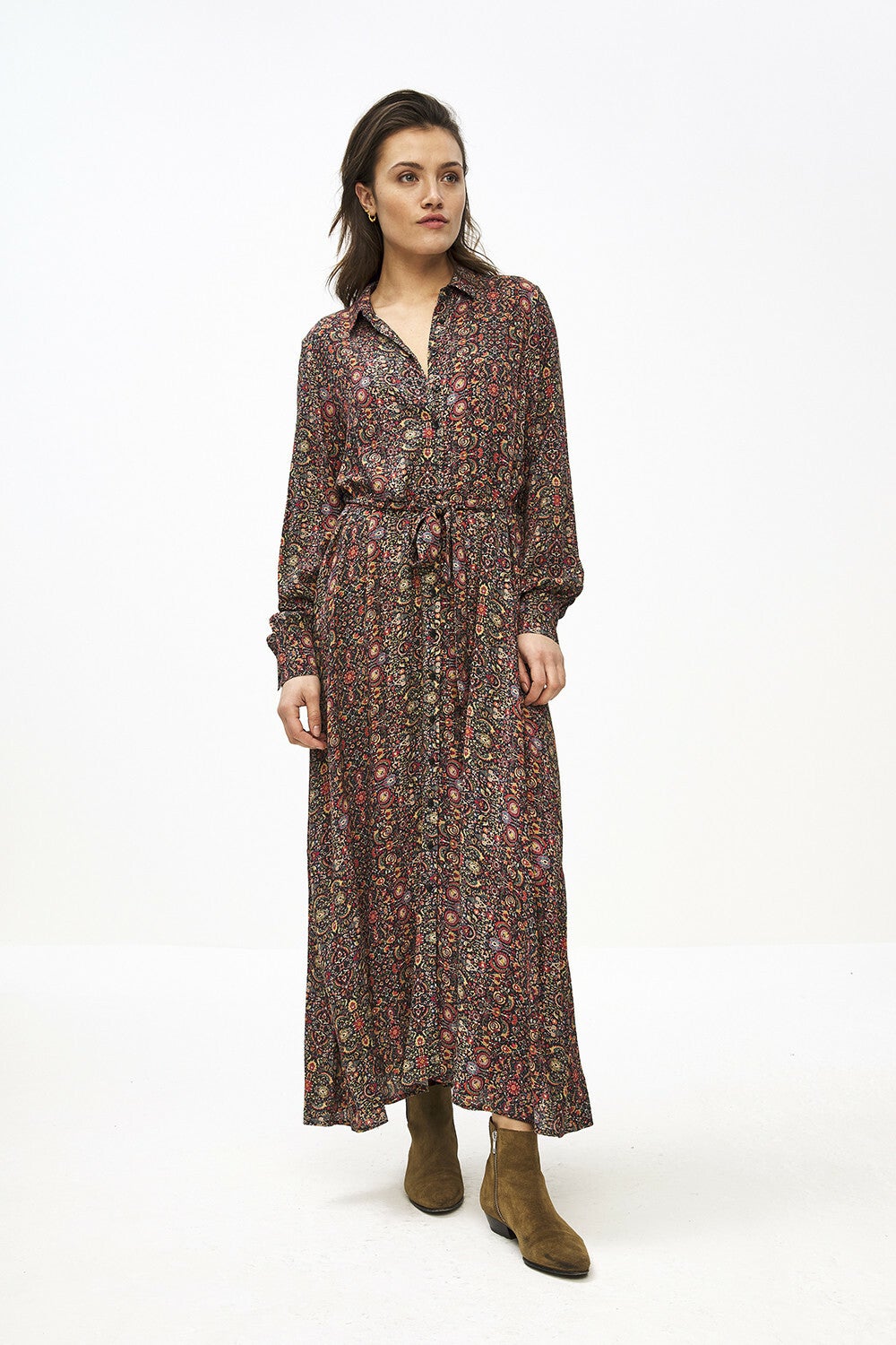 De yara indian small flower dress is gemaakt van een rijke viscosekwaliteit. De lange jurk heeft een kraagje en in de stof is een bloemmotief verwerkt. Daarnaast is de jurk voorzien van een knoopsluiting aan de voorkant. De mouwen sluiten nauw aan aan de pols, welke is voorzien van een knoopsluiting, waardoor er een blousend effect ontstaat. De jurk wordt met een ceintuur geleverd. The ultimate dress for this season.