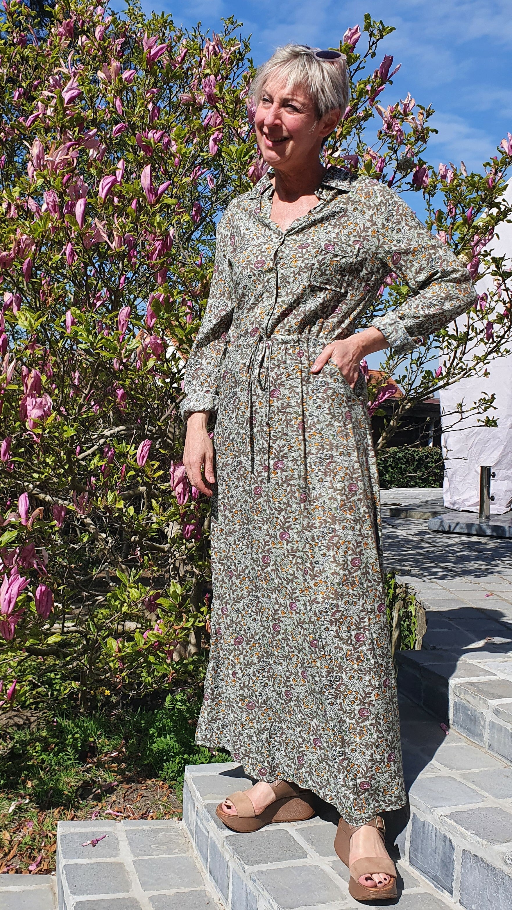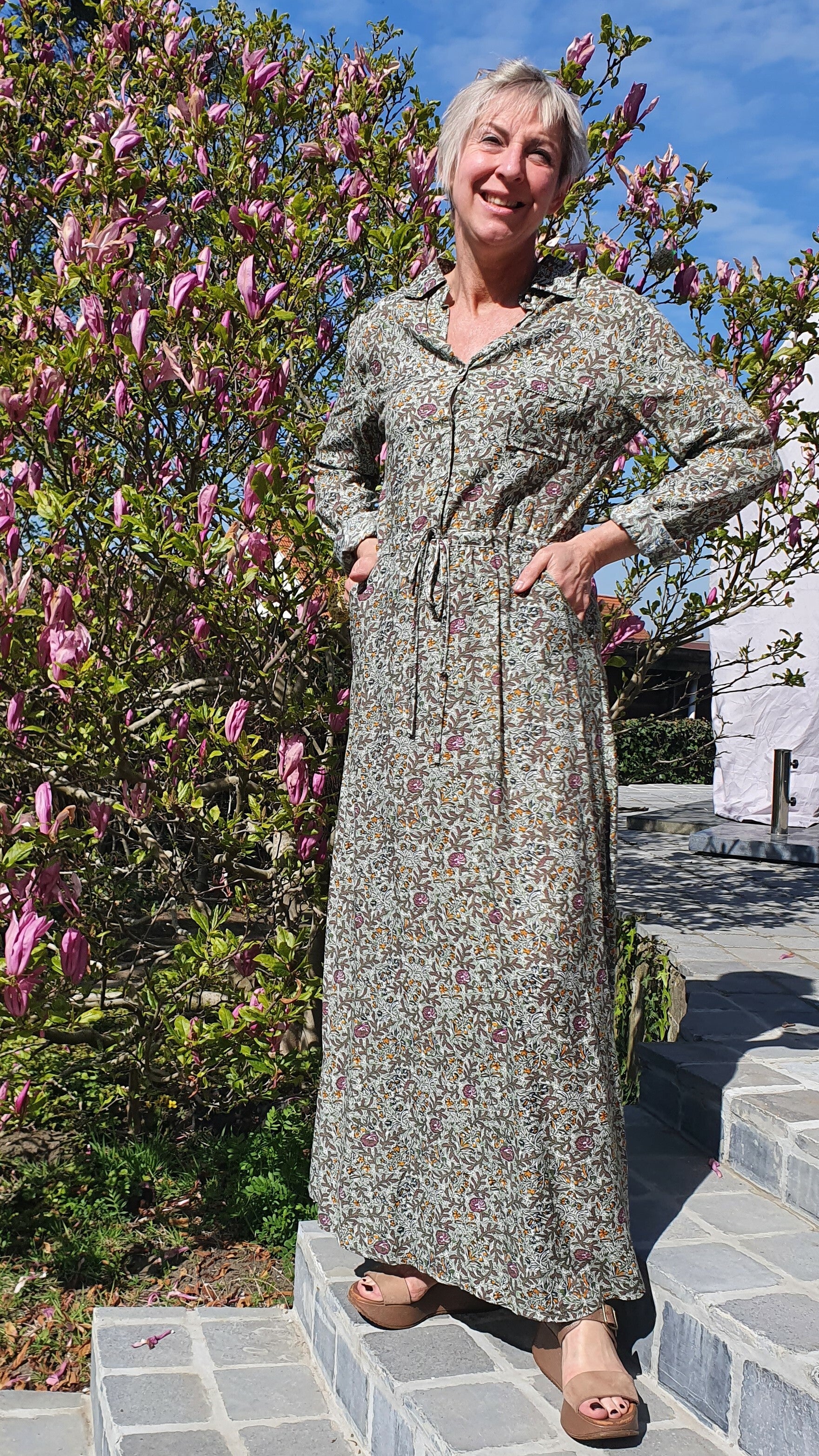 Lange jurk met bloemenprint • Lange mouwen • Kraag • Knopenlijst met ton sur ton knopen • Opgestikte zakken op de borst • Taille aangespannen door stoffen stroplintje
