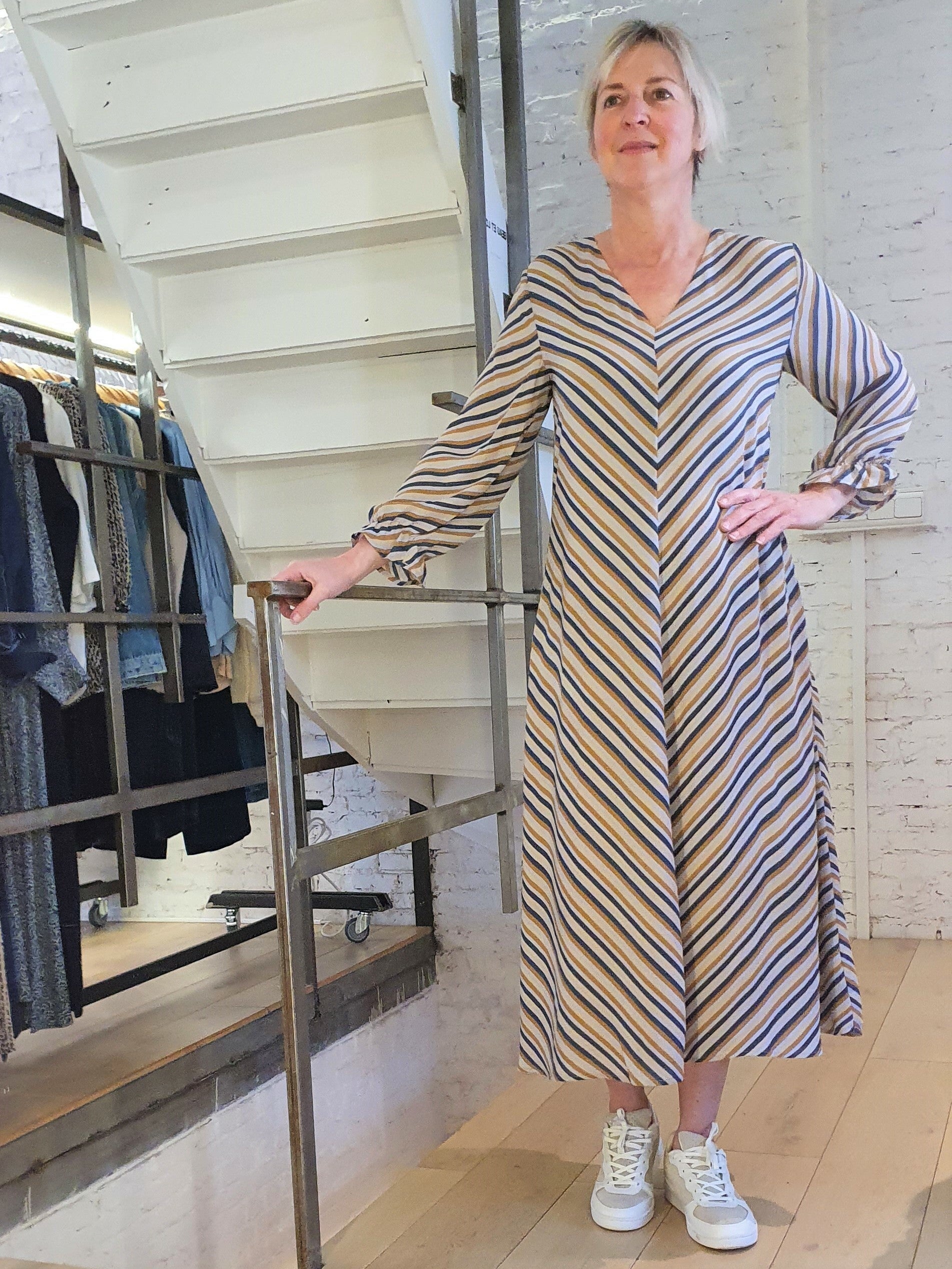 Deze coole strepenjurk van Modström is gemaakt van gerecycled polyester (duurzaam) . De jurk heeft verder een V-hals en lange mouwen met een elastische rand, wat zorgt voor een vrouwelijke look