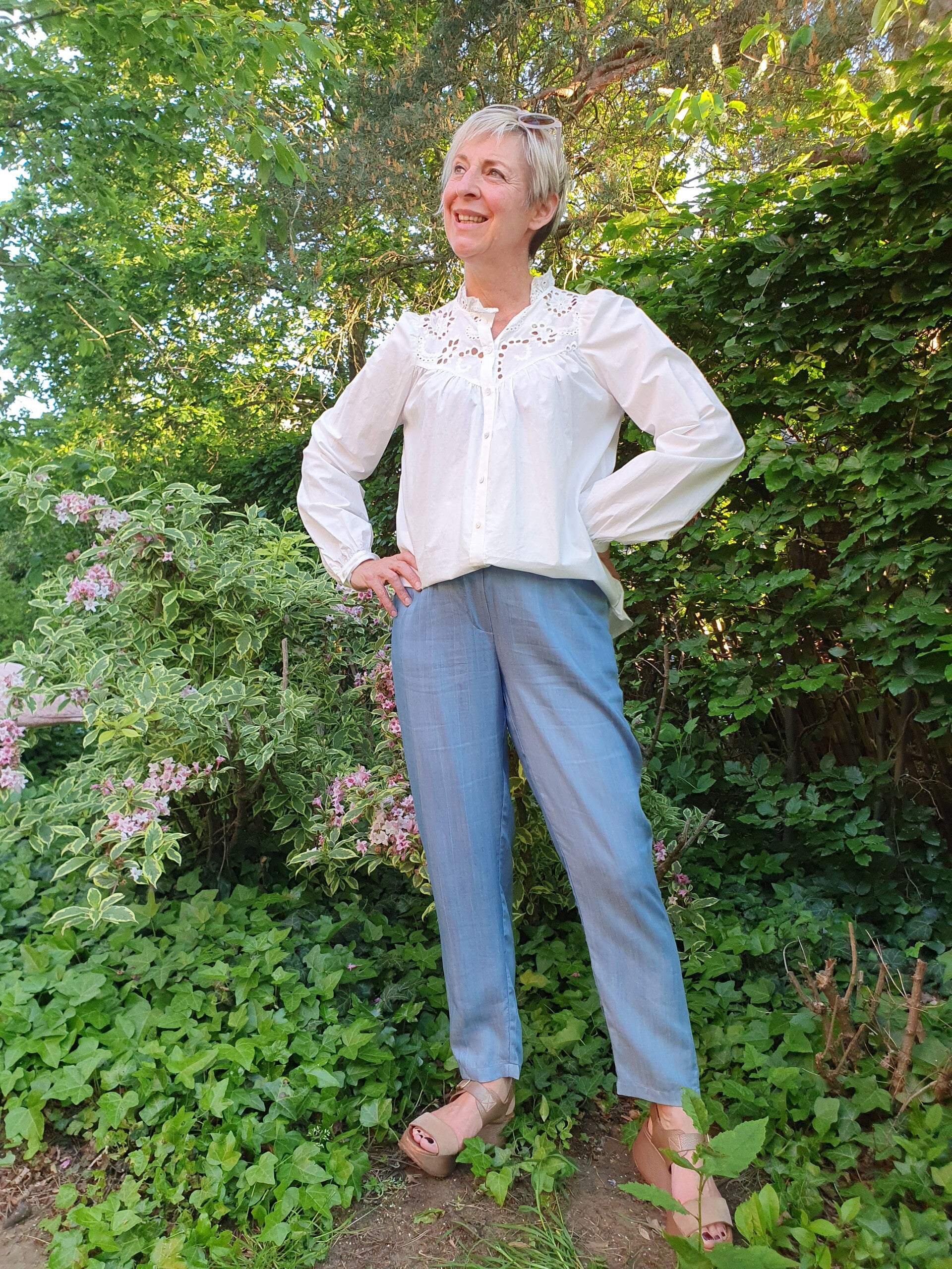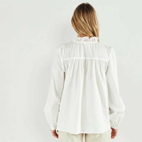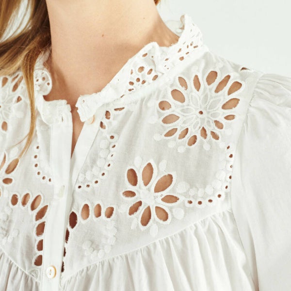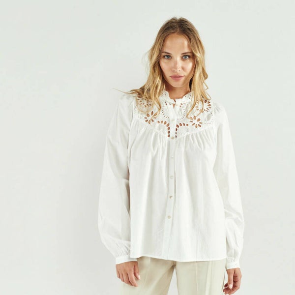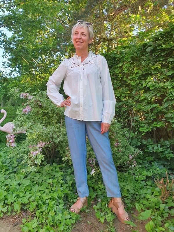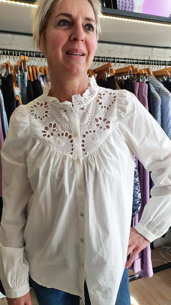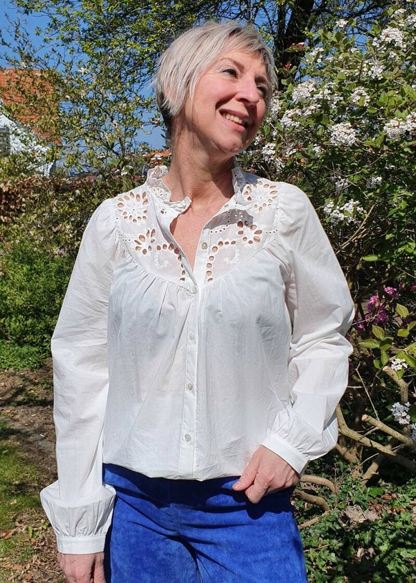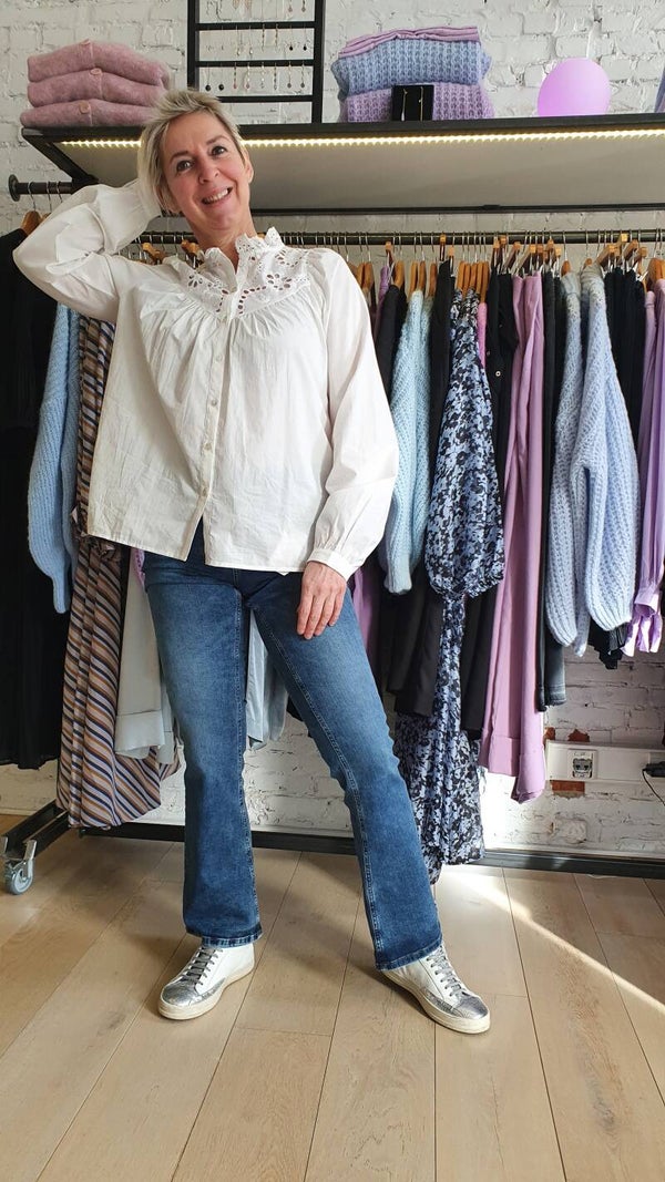Deze romantische katoenen blouse is ideaal voor deze lente. De blouse is van 100% katoen waardoor ze zeer aangenaam is om te dragen; zelfs bij zomerse temperaturen.
