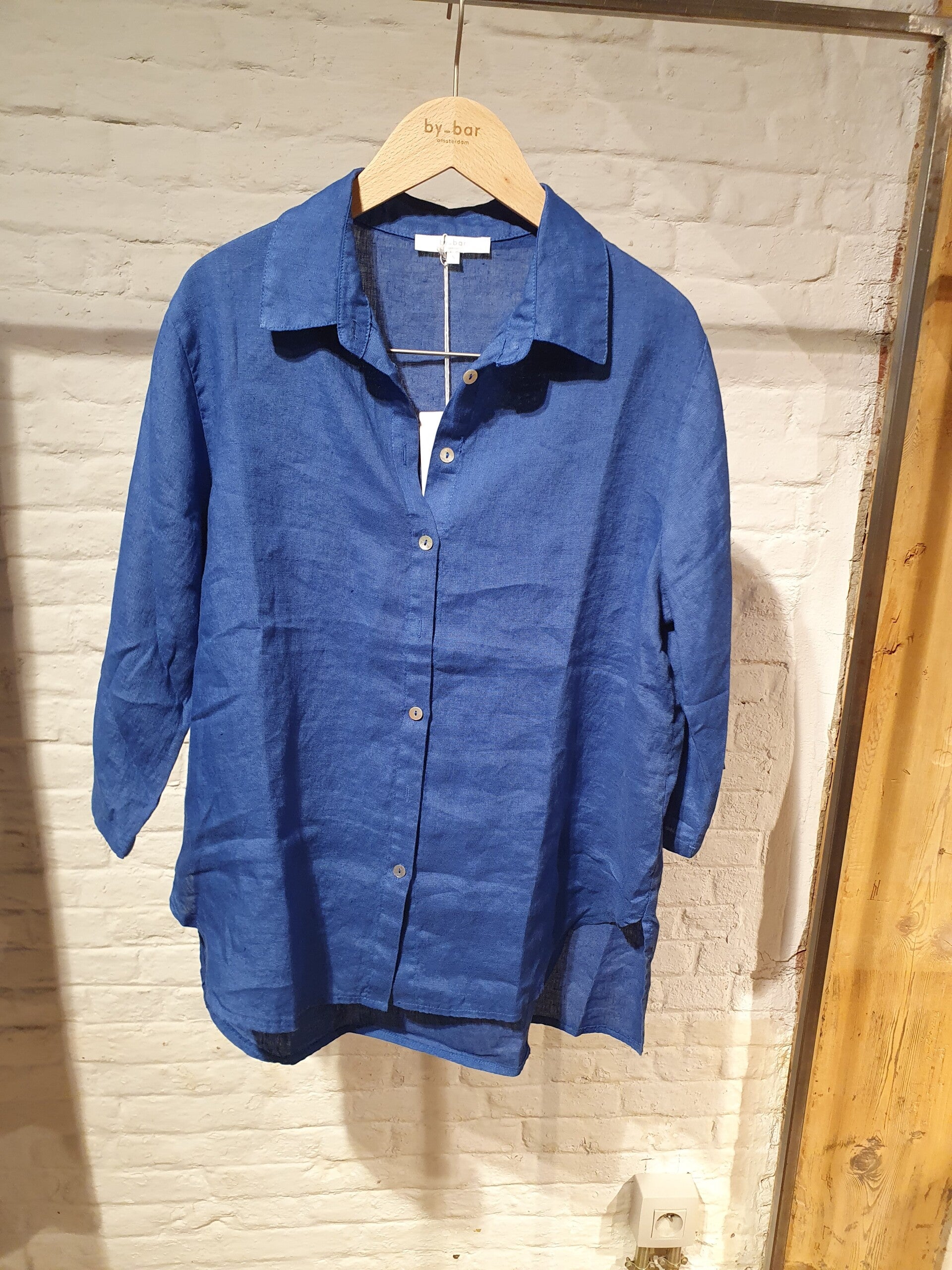 Deze super mooie linnen blouse van prachtige kwaliteit is een echte favoriet. Het is een heerlijke luchtige, ruimvallende blouse. De blouse heeft een klein kraagje en knopen aan de voorkant. Daarnaast heeft de blouse een driekwart mouw die je naar wens kunt oprollen. De achterzijde van deze blouse valt langer dan de voorzijde en is voorzien van splitjes aan de zijkant. De blouse is licht doorschijinend.