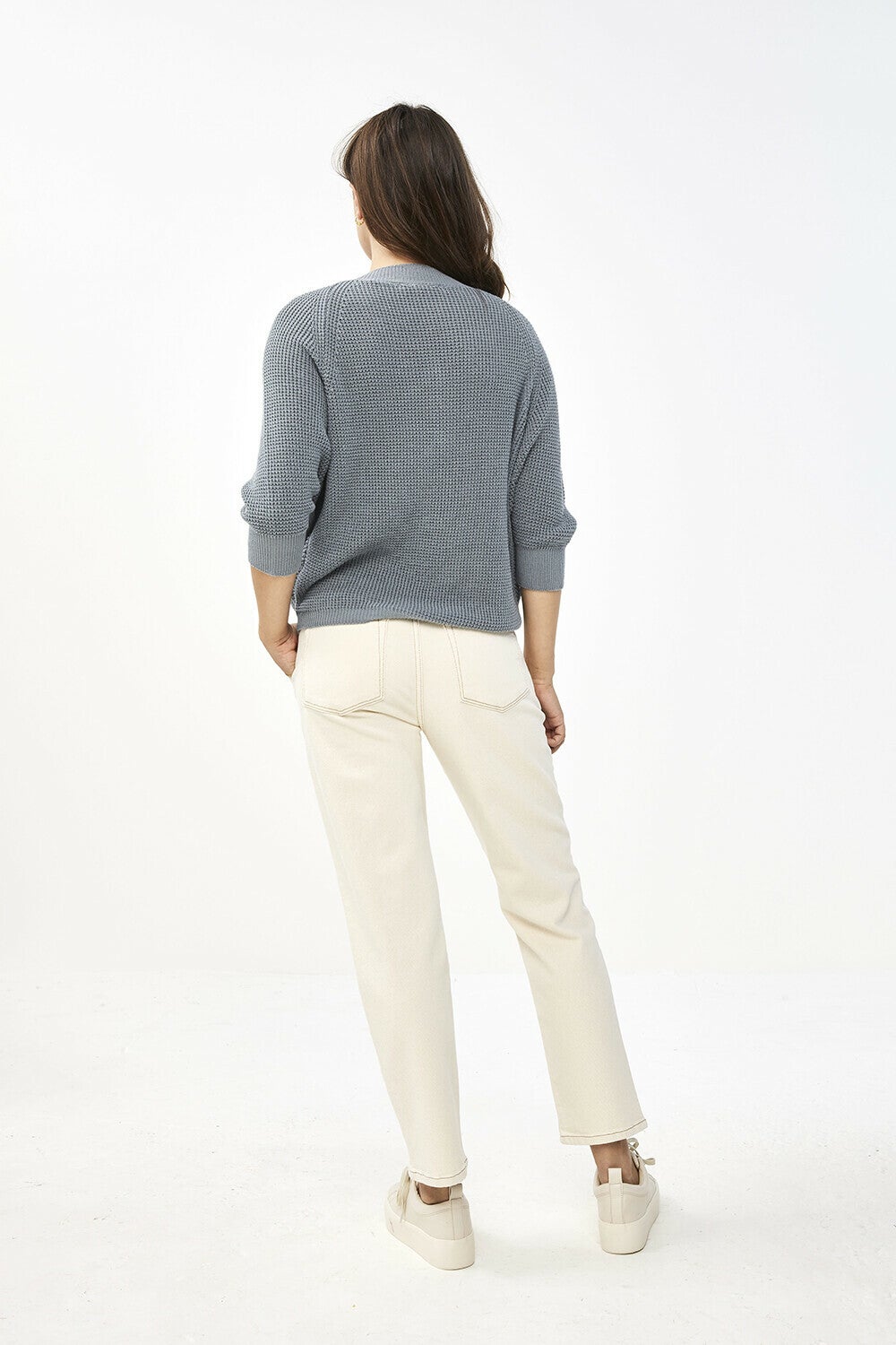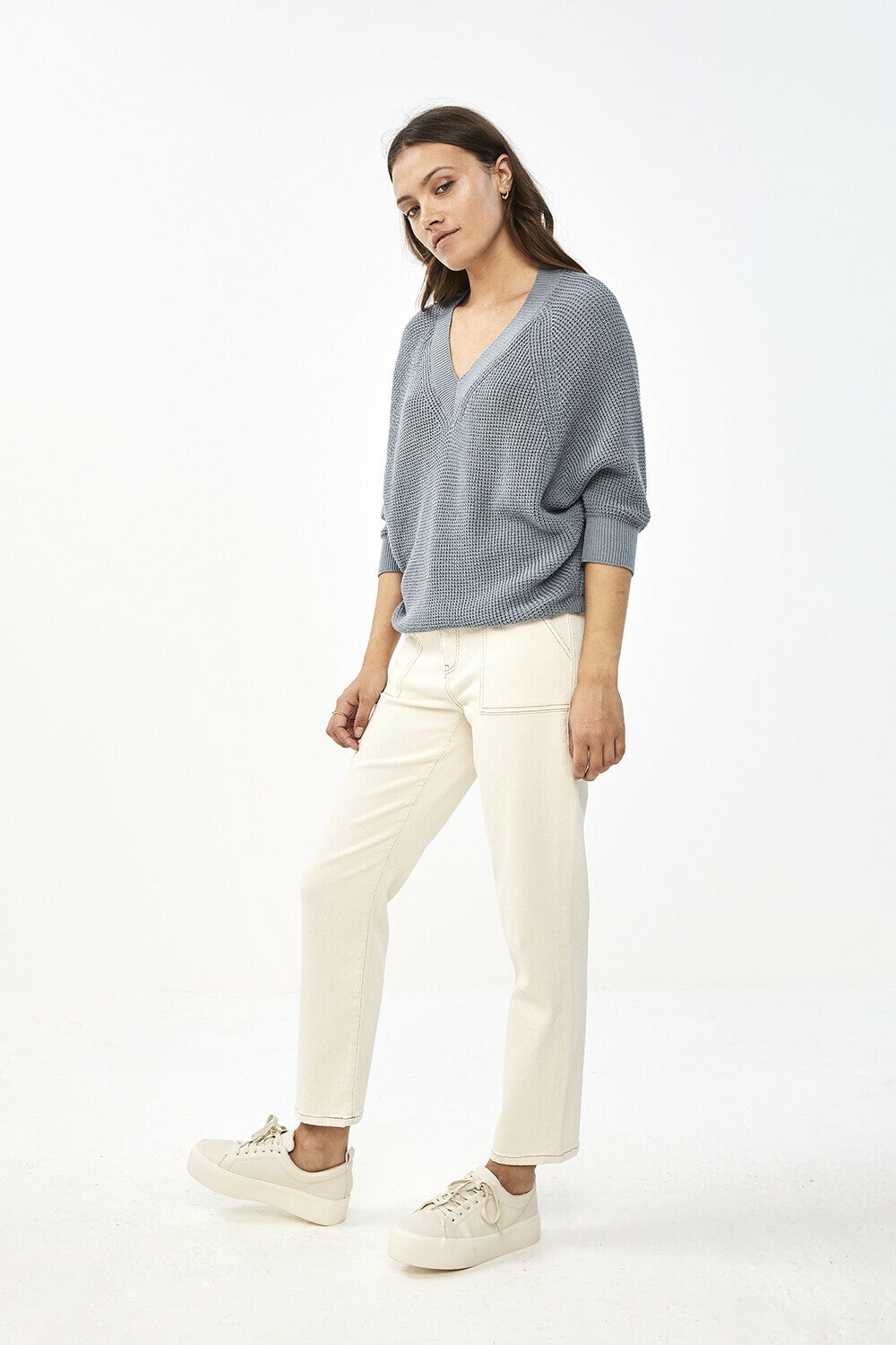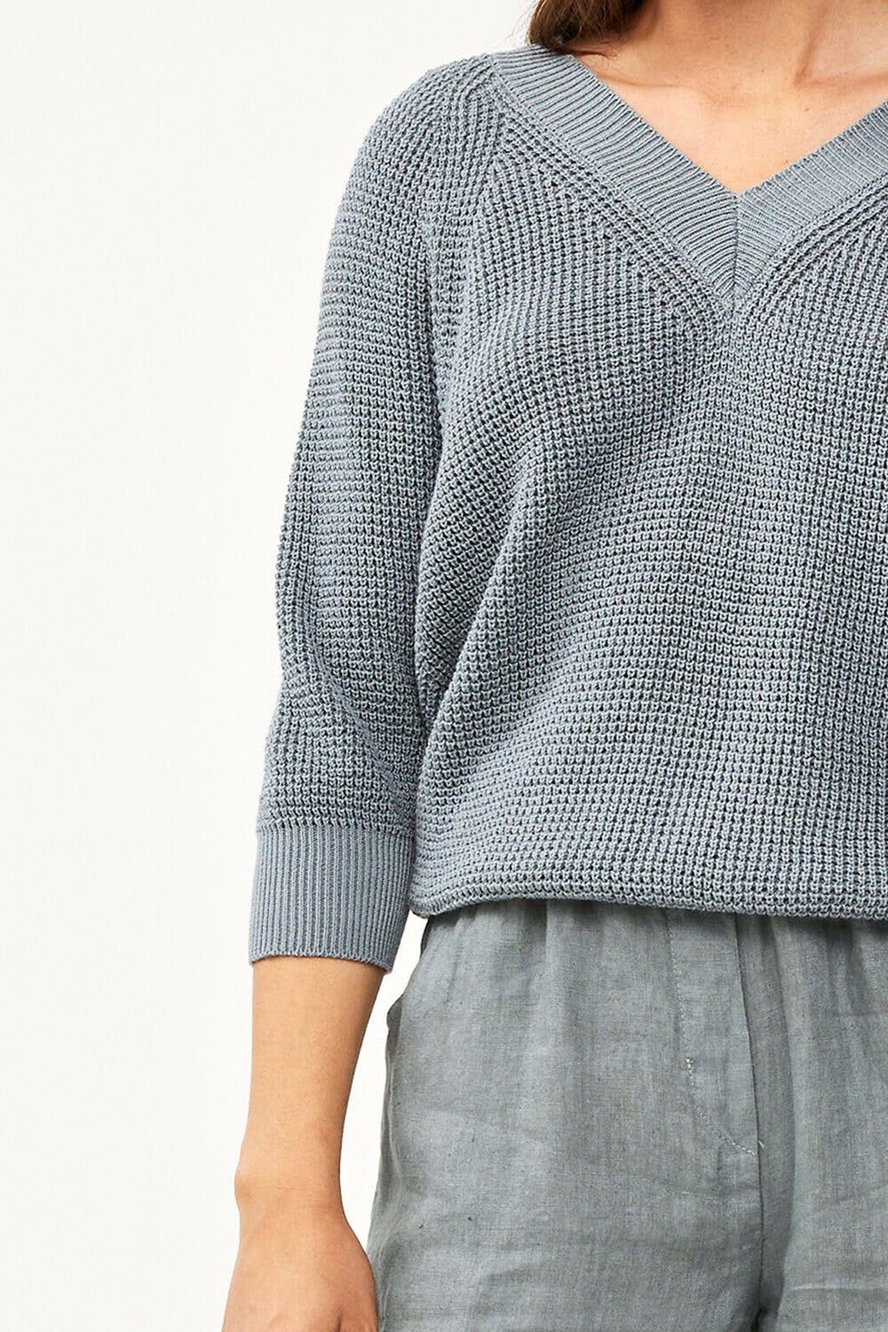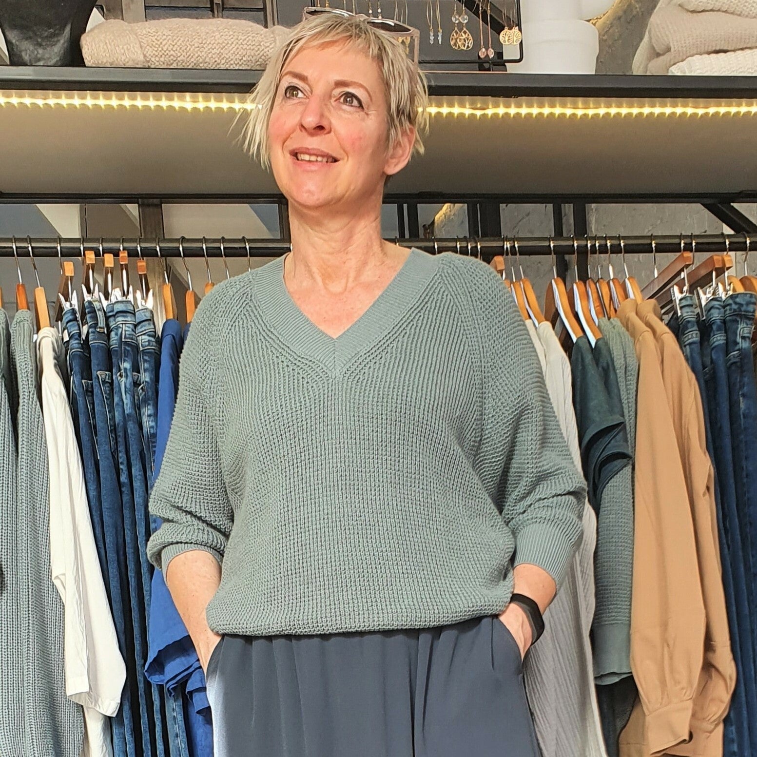 De june pullover is gemaakt van een super zachte katoen kwaliteit. Deze trui heeft een mooie v-halslijn die zorgt voor een feminine uitstraling. Dat in combinatie met de vlindermouw zorgt ervoor dat deze katoenen trui een alltime favorite is. De trui heeft een driekwart mouw en de verschillende manieren van breien geeft deze trui een unieke uitstraling.