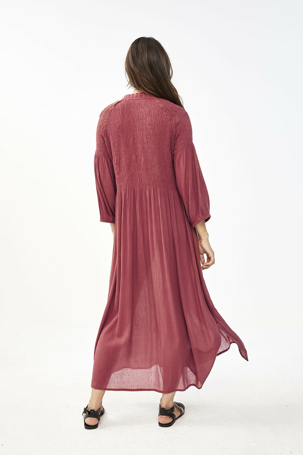 We love flowy this dress! De loulou smocked dress is gefabriceerd van een rijke blend van viscose en katoen. Dit zorgt ervoor dat de jurk heel zacht en luchtig aanvoelt en ideaal is voor deze tijd van het jaar. De voor- en achterkant van deze jurk heeft een prachtig smockwerk. De voorkant van de jurk is voorzien van een knoopsluiting tot halverwege. De jurk heeft een ronde halslijn met een klein geplooid boordje en een driekwart mouw voorzien van een elastieken boord. Dit zorgt voor een blousend effect. Verder heeft de jurk aan de onderkant een split.