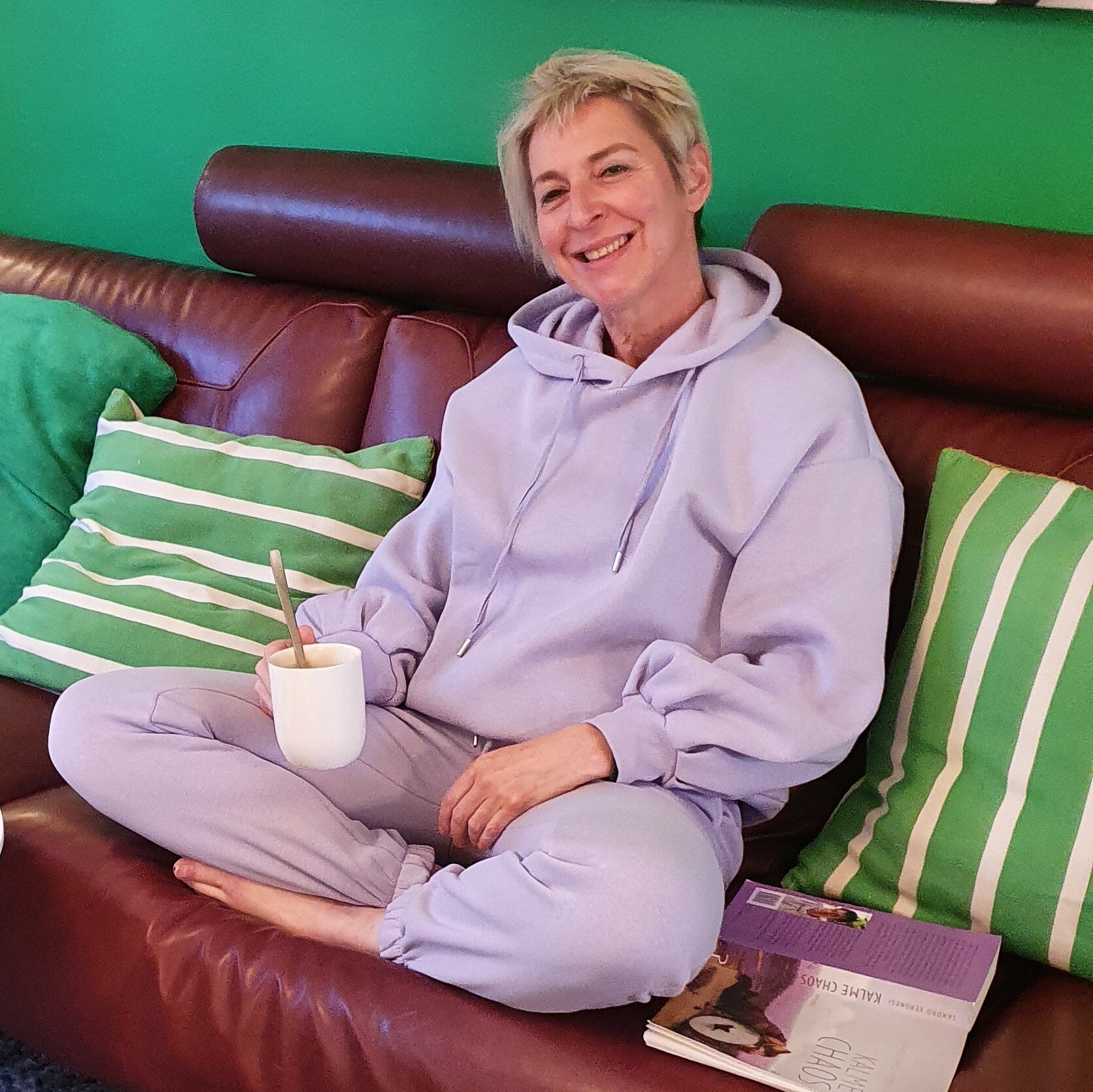 Deze zachte lavendelkleurige sweater met kap is leuk om te combineren met de bijpassende joggingbroek, maar ook leuk op een zwarte broek of jeans