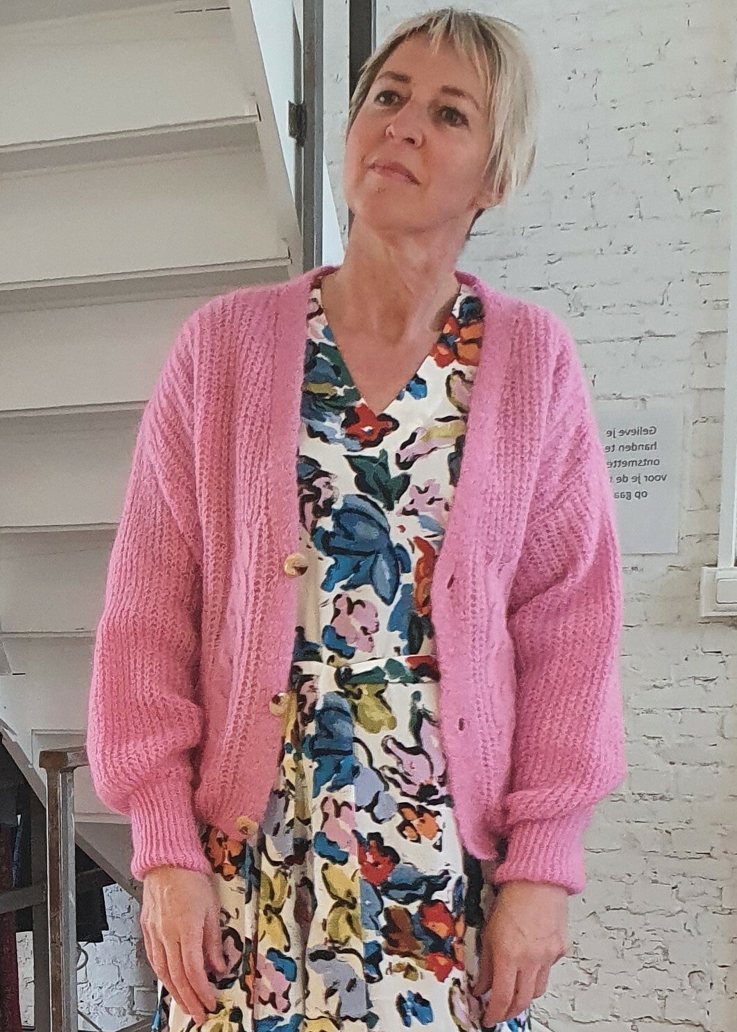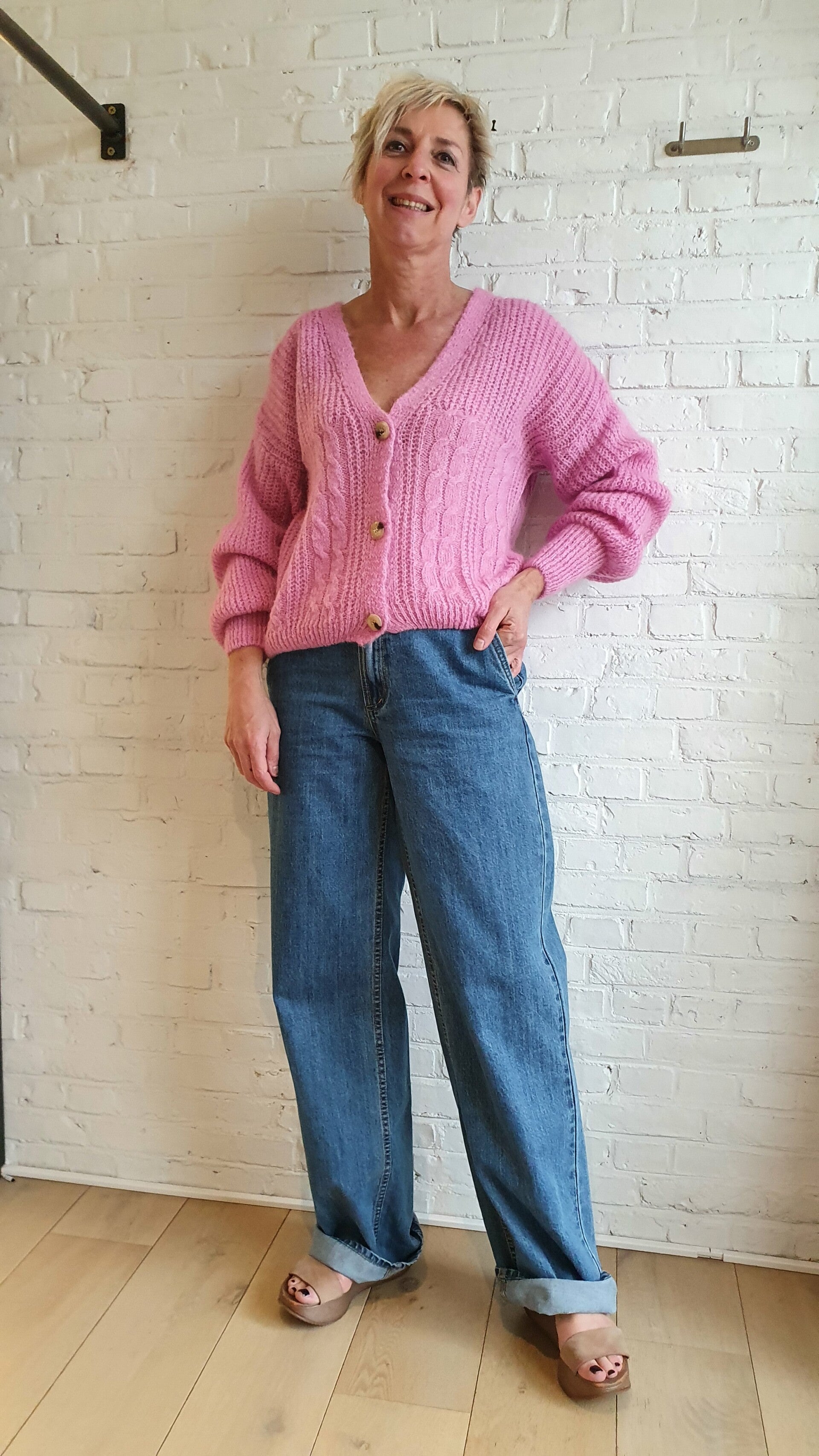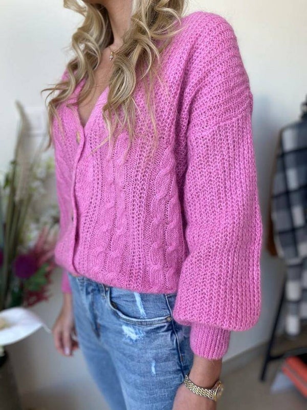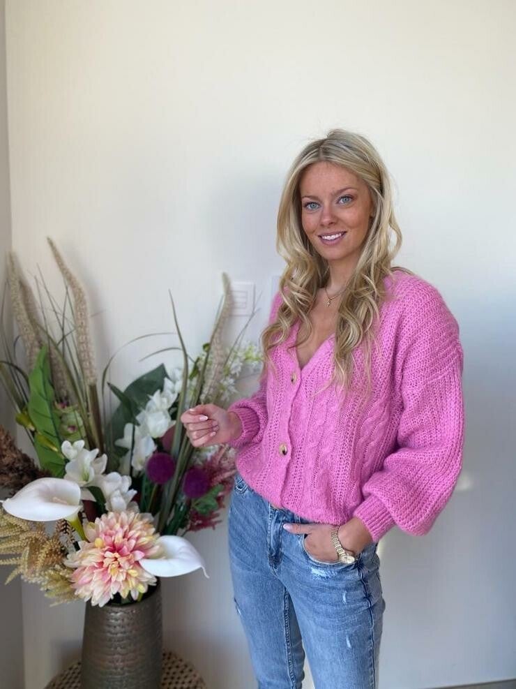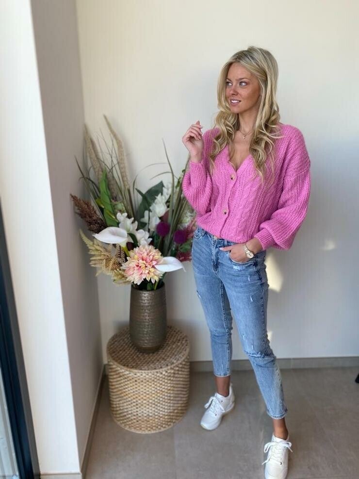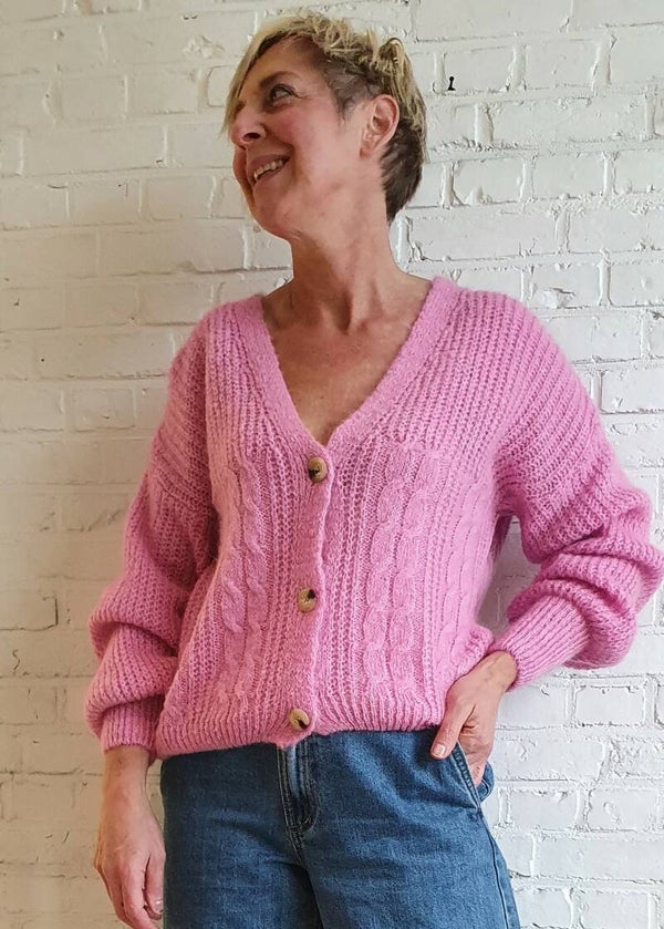 gebreide cardigan met prachtig kabelmotief in lila kleur. Samenstelling : 48% acryl, 20% polyamide, 22% mohair 10% wol