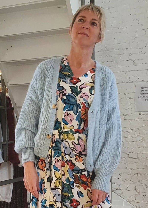 gebreide cardigan met prachtig kabelmotief in lila kleur. Samenstelling : 48% acryl, 20% polyamide, 22% mohair 10% wol