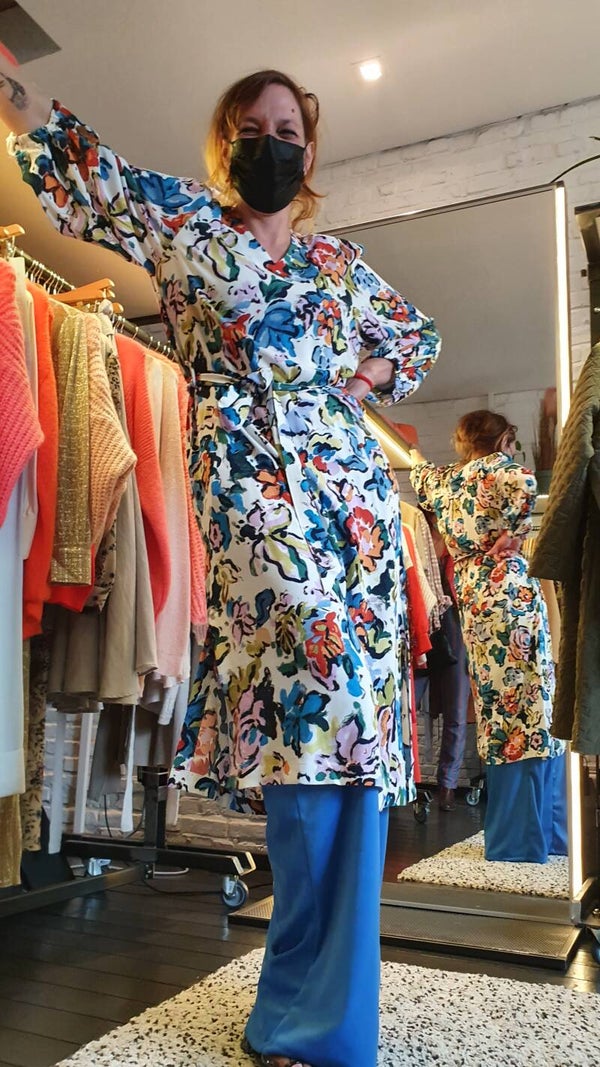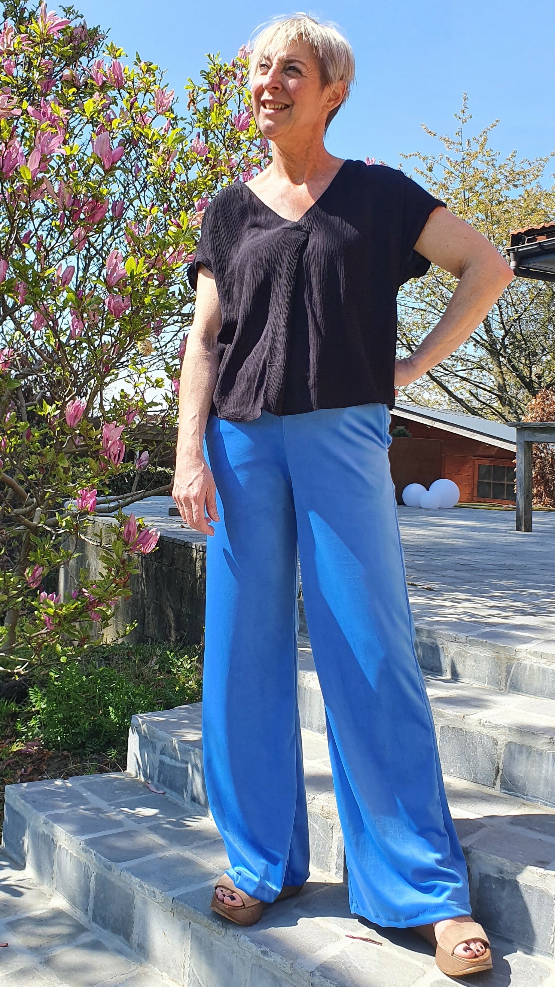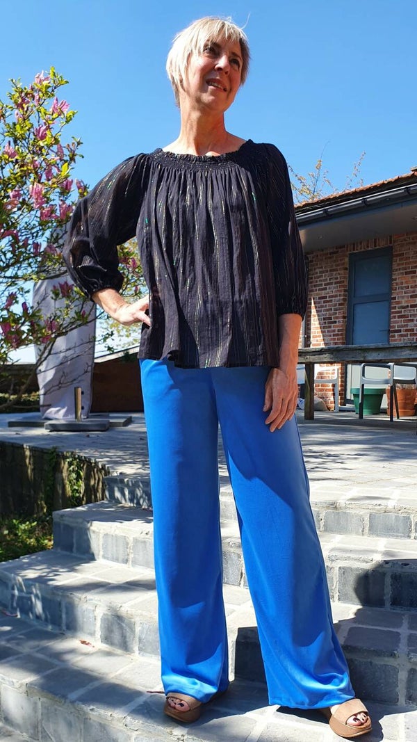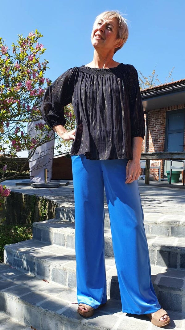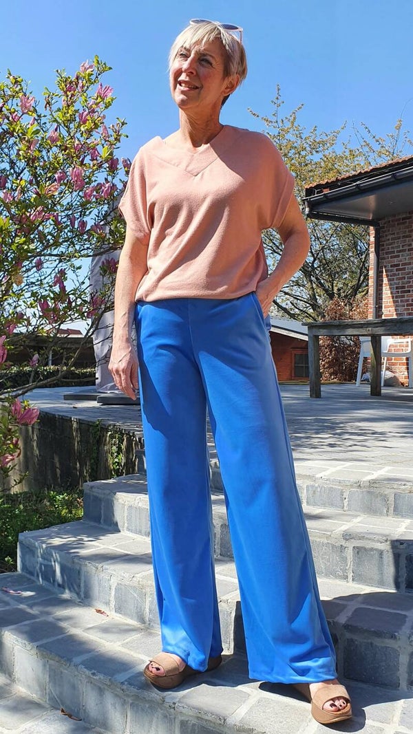 Super zachte en comfortabele broek met zijzakken in stretch fluweel.Elastiek enkel vanachter, geen knopen noch rits. Vallen vrij ruim.