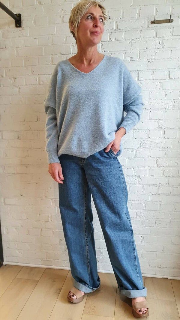 losse lichtblauwe trui met v-hals