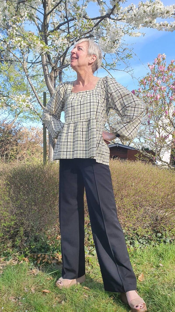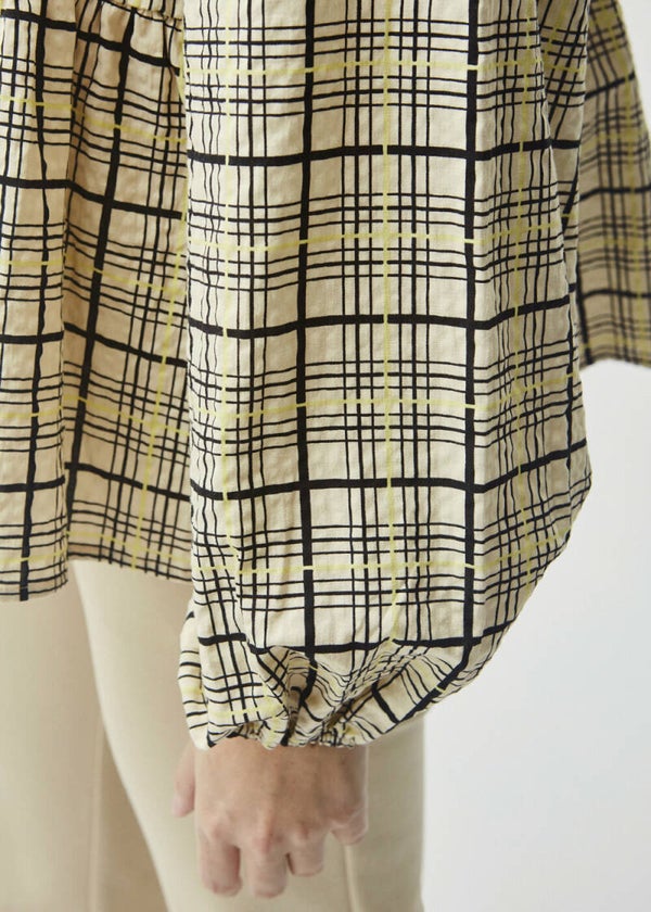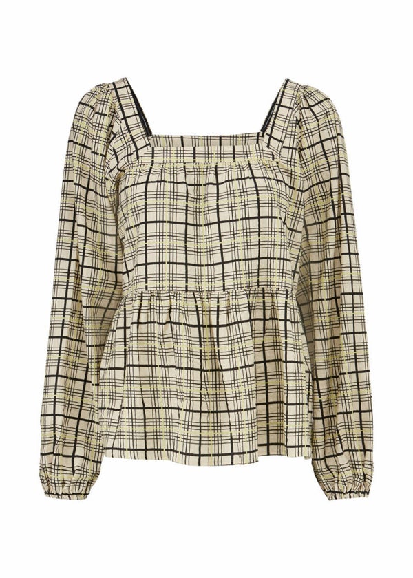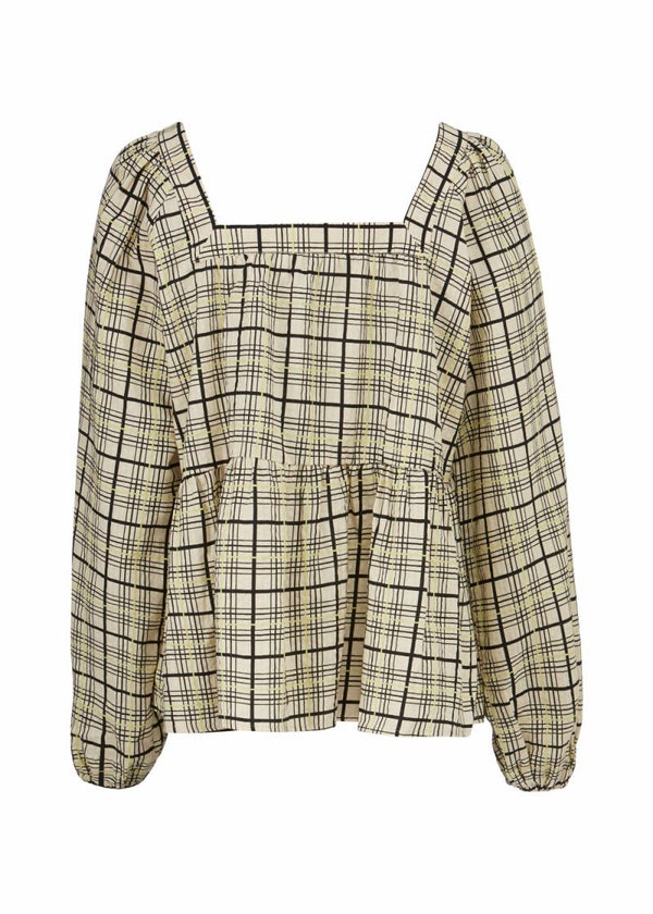 Vrouwelijke top met vierkante halslijn in een grafische print. De top is gemaakt van een mooie katoenmix met structuur en heeft een cutline over de taille om volume te creëren. 80% katoen, 20% viscose