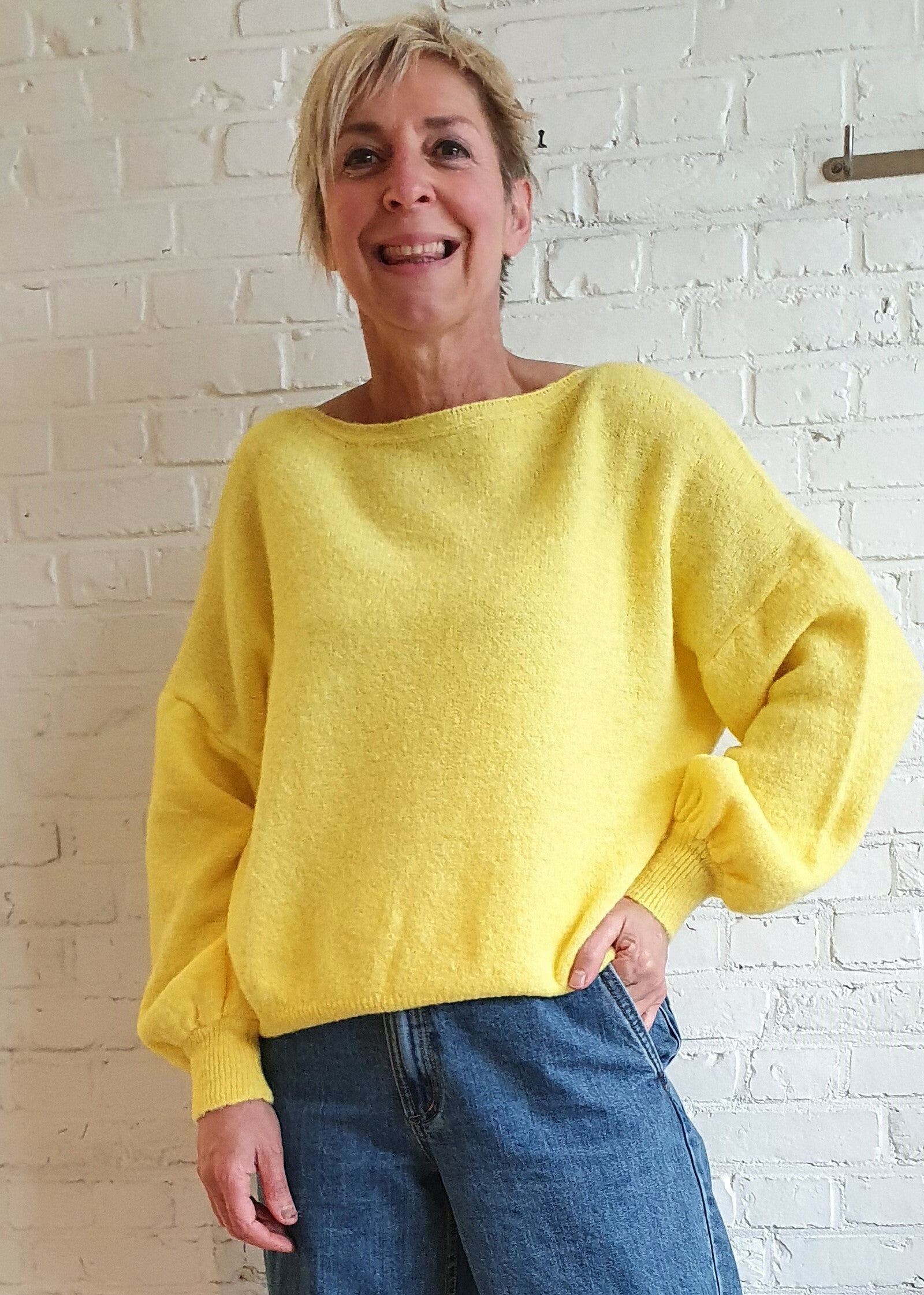 kanariegele trui met boothals