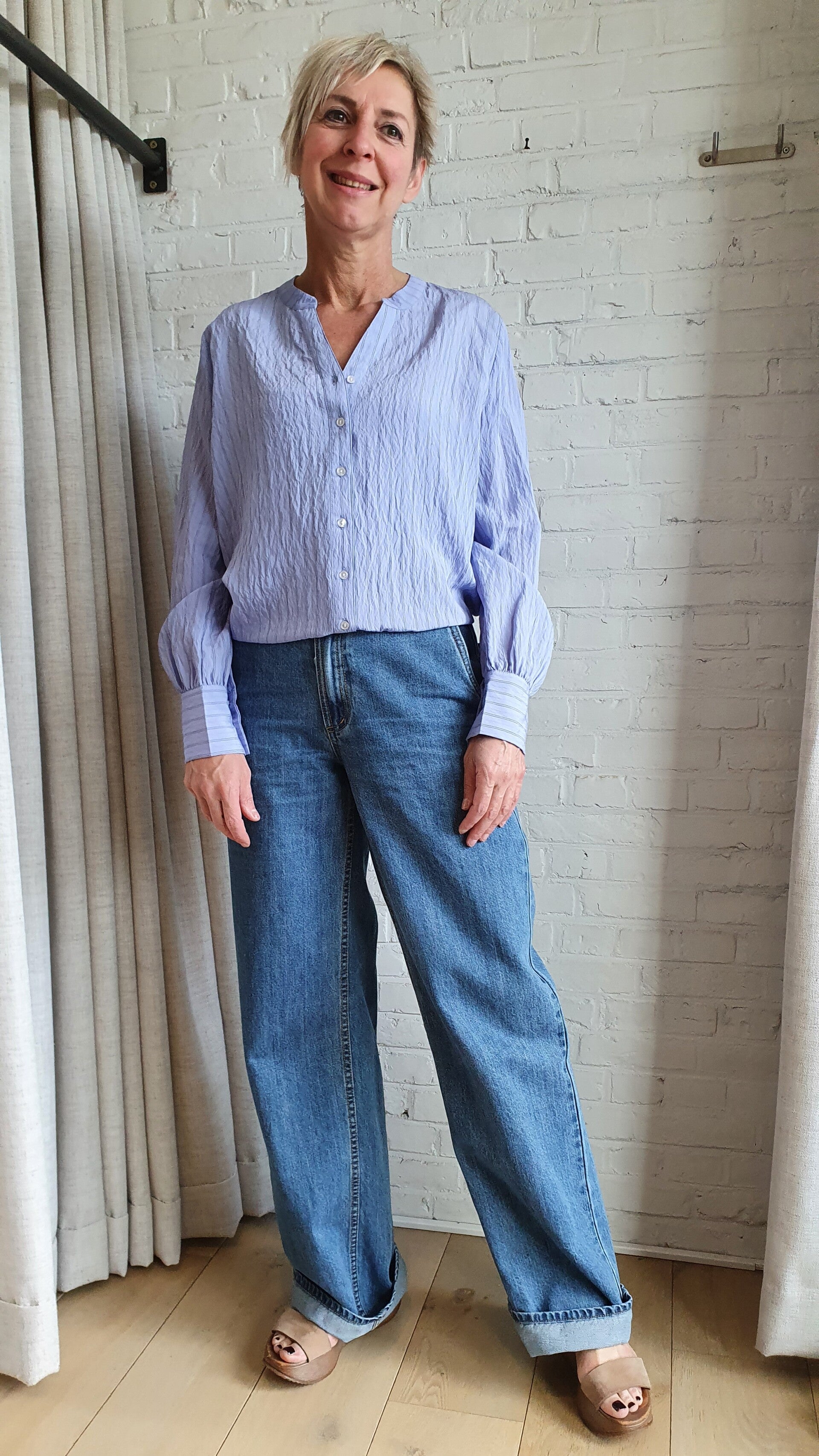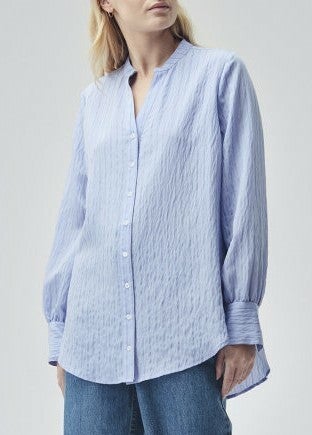 Vrouwelijk, gestreept overhemd met eenvoudig kraagje en hoge manchetten. Het overhemd heeft een v-hals wat het ontwerp elegantie geeft. 76% rayon, 19% nylon, 5% polyester