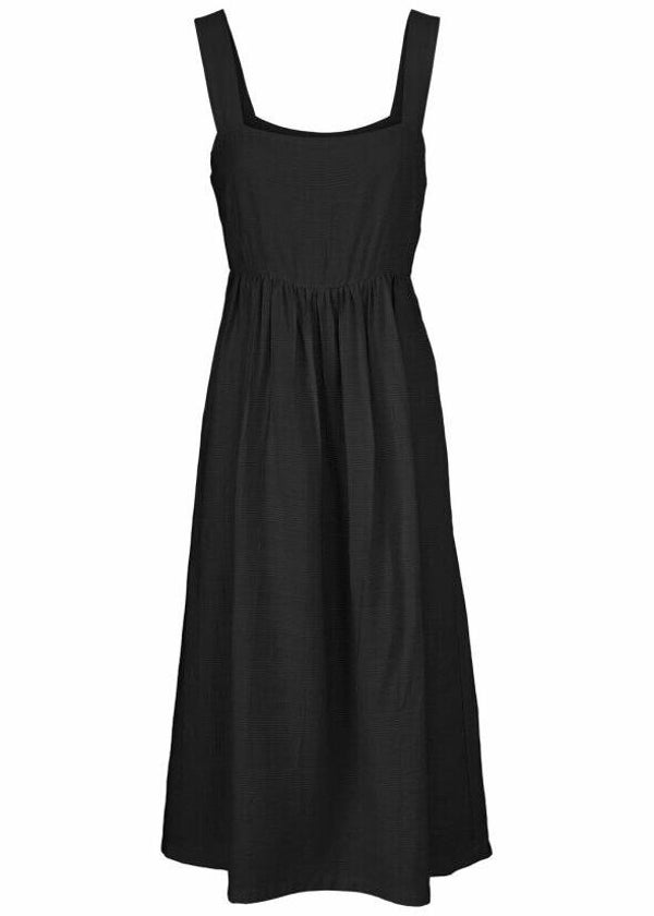 Zwarte jurk met schouderbandjes en een geborduurd patroon in de stof. De jurk komt halflang en heeft een voering en een ingewerkte rits aan de zijkant.