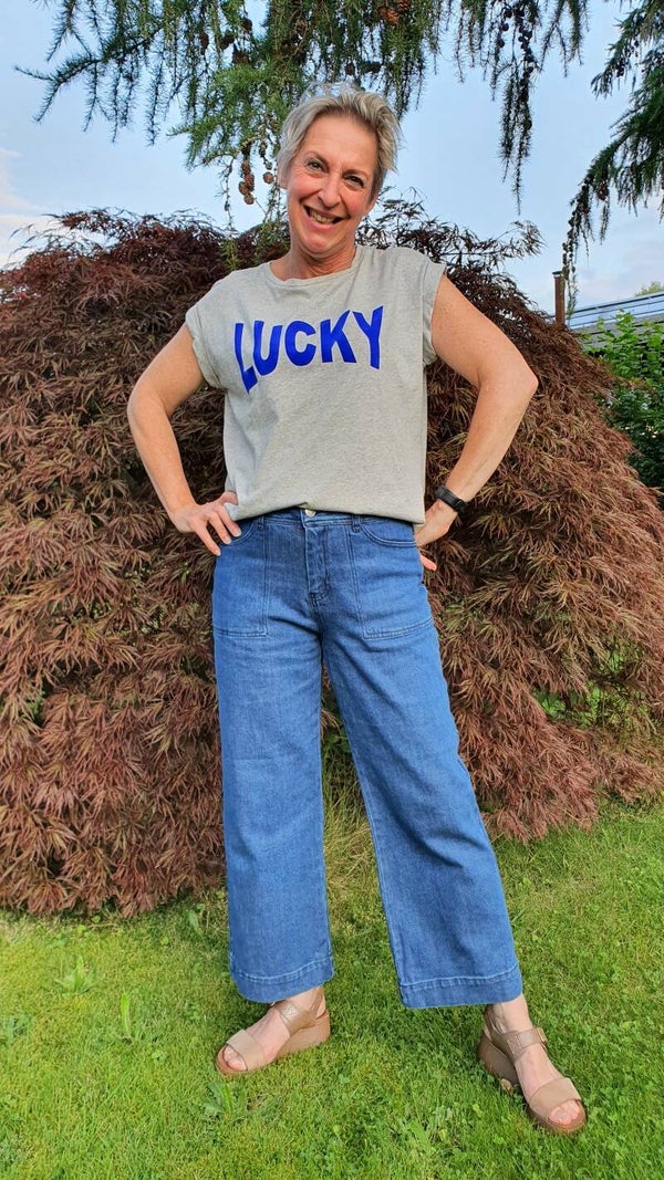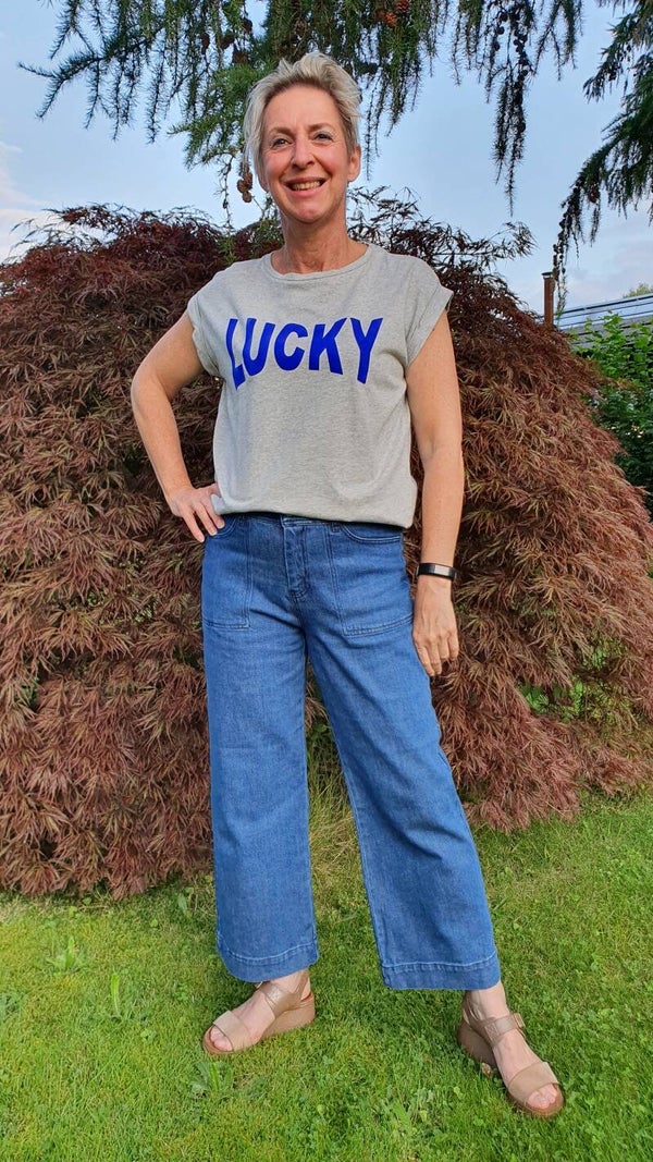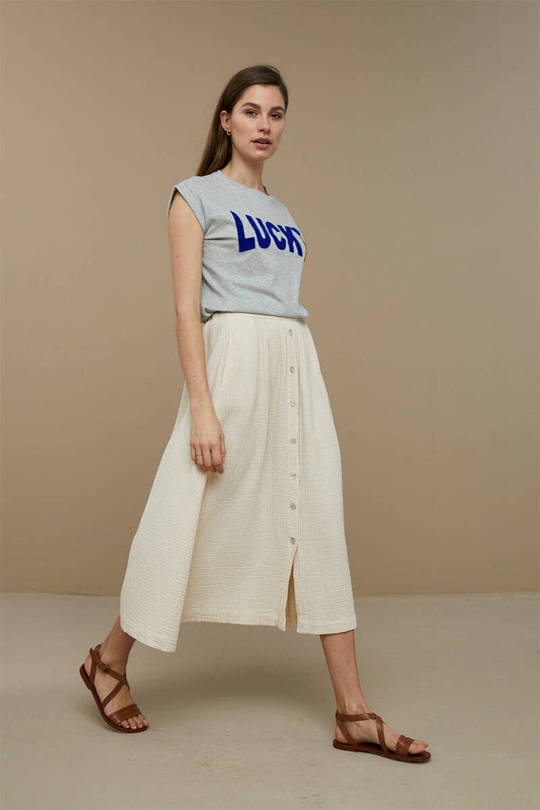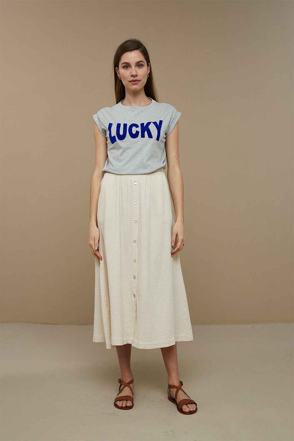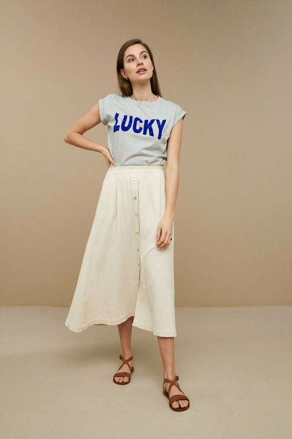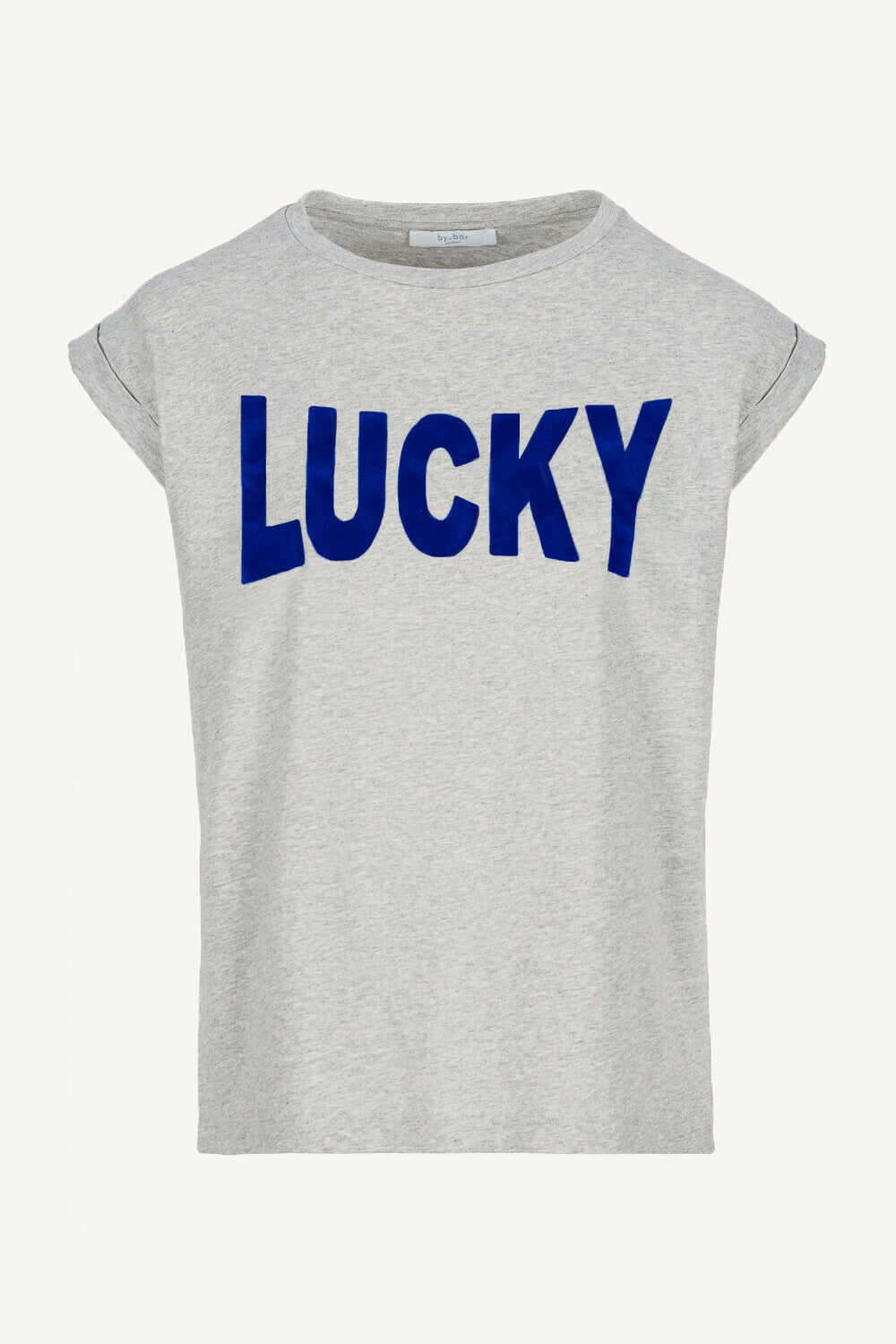 Deze mooie top is vervaardigd uit een zachte organic katoen kwaliteit, wat zorgt voor een optimaal draagcomfort. De top is voorzien van een ronde hals, een korte mouw en is voorzien van een flocked print, met de tekst 'lucky'.