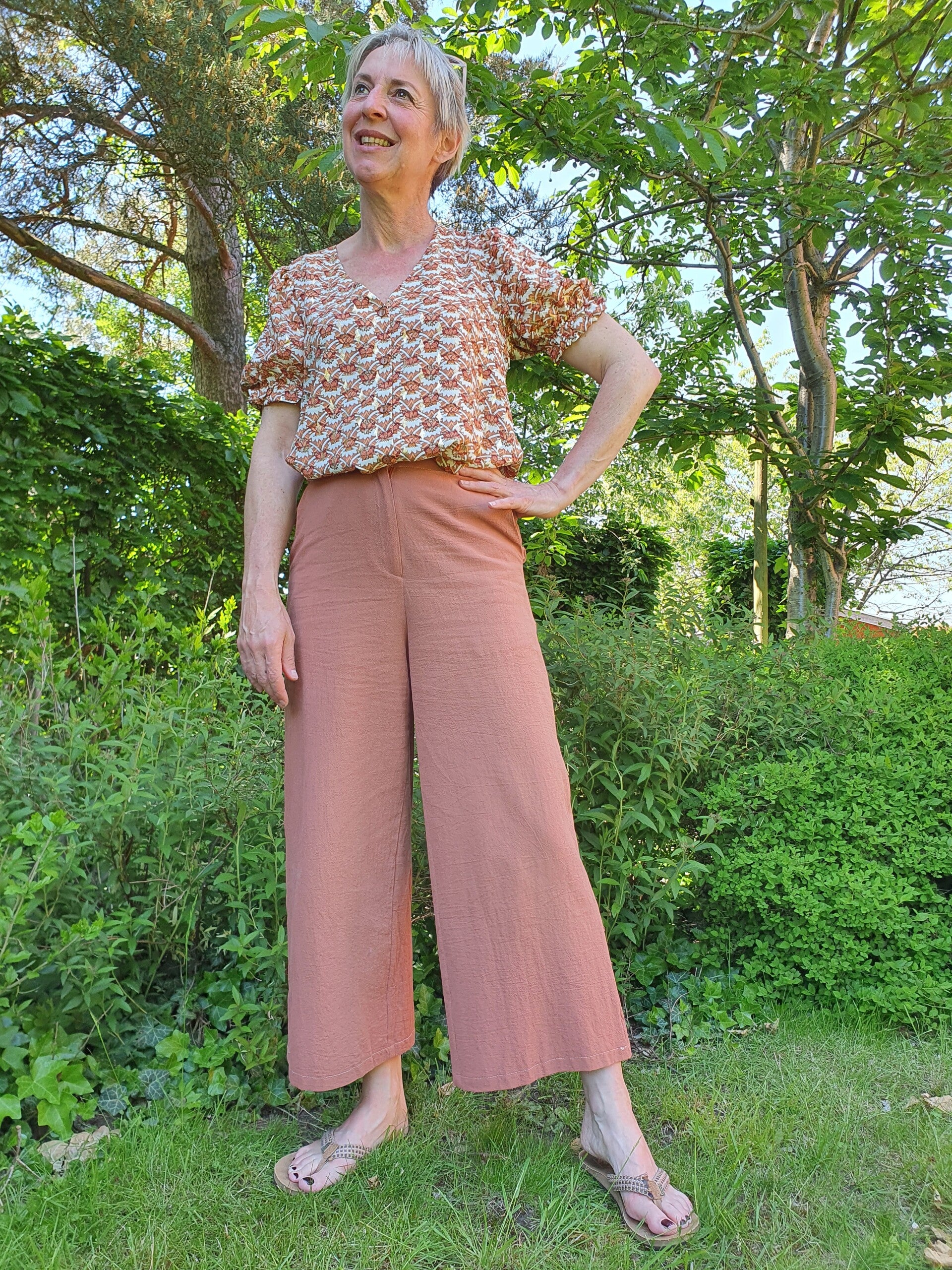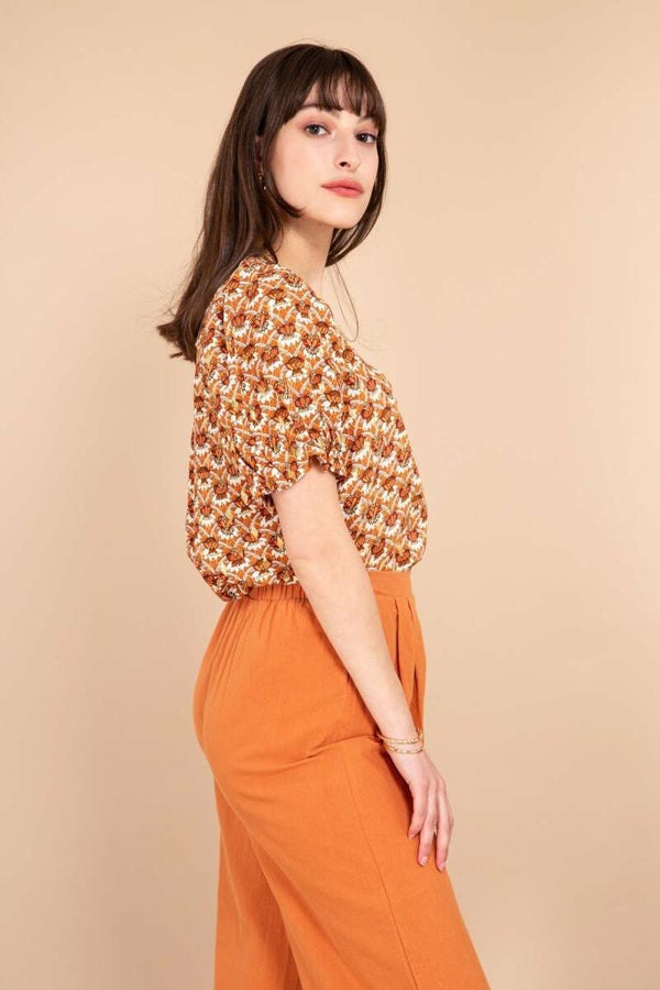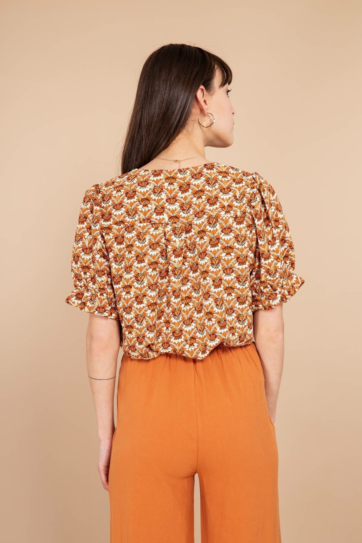 dit mooi zomers blousje heeft een print in roestkleuren met een gouden accent. De blouse heeft pofmouwen en knoopjes