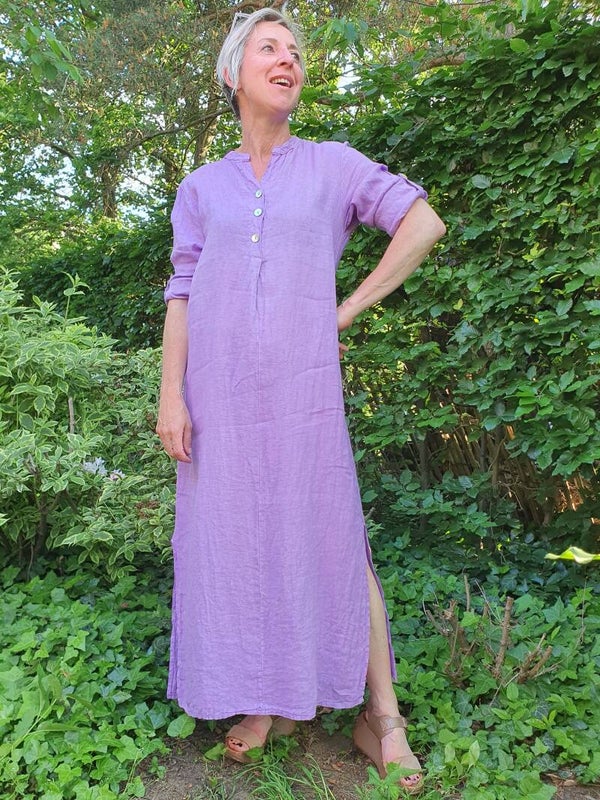 deze lange lila jurk in linnenkwaliteit is heerlijk luchtig op warme zomerdagen