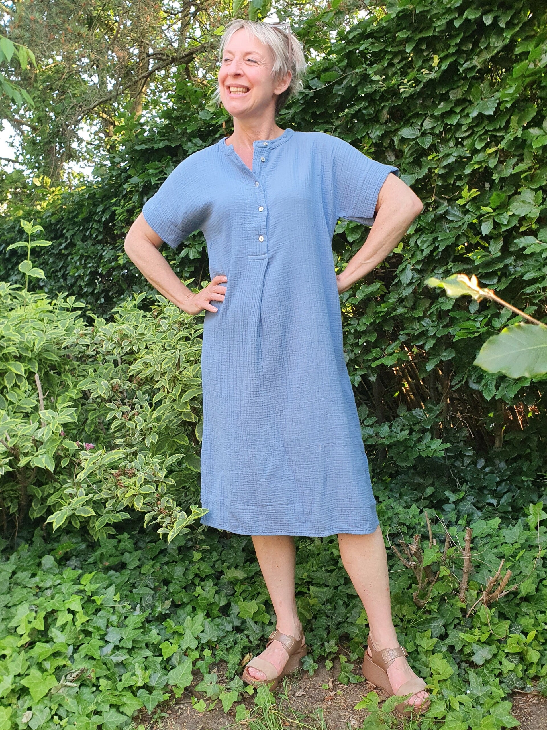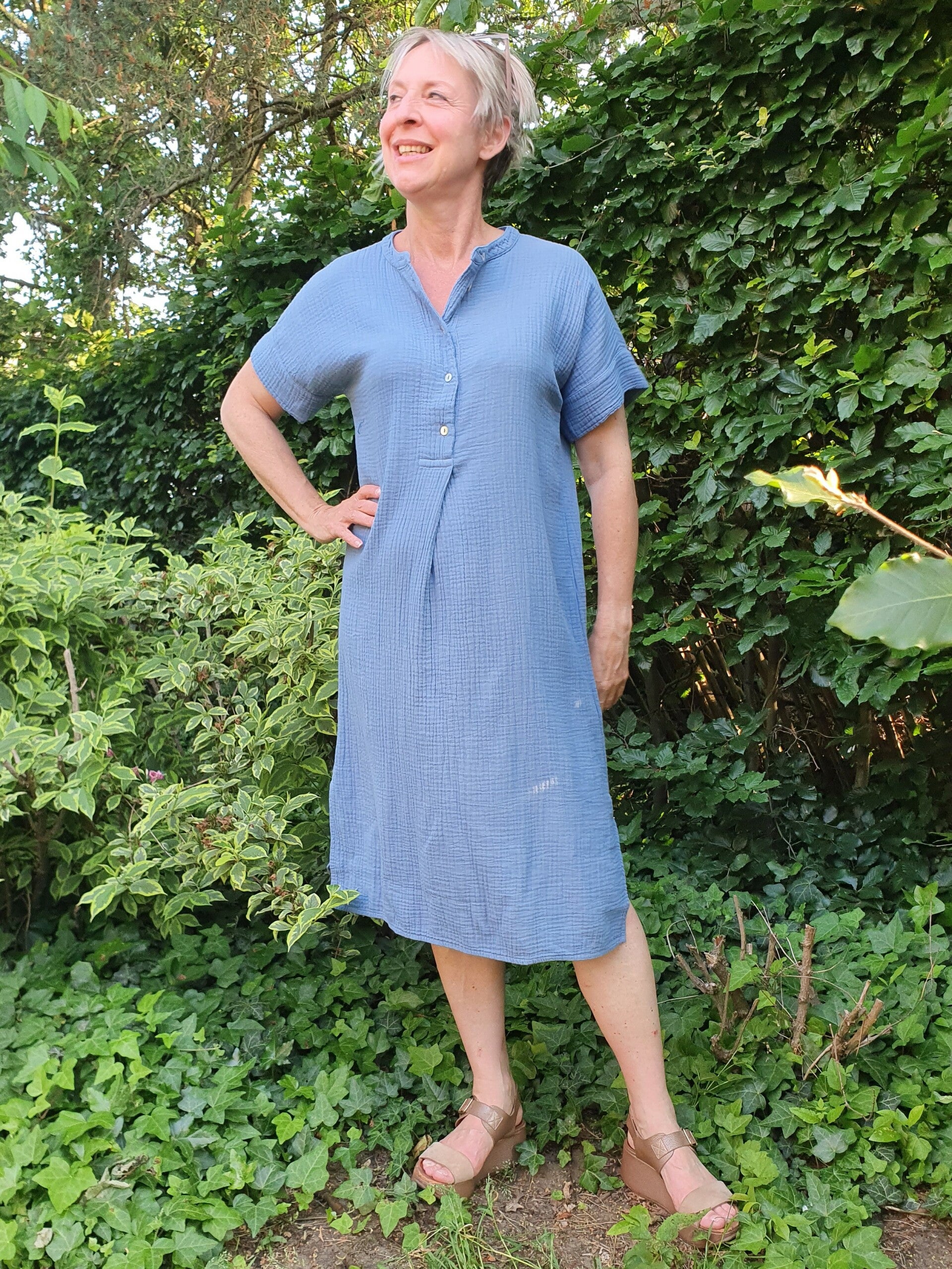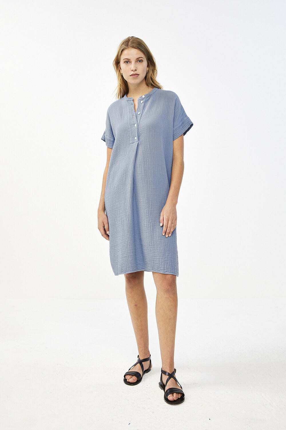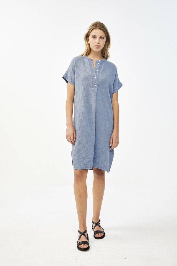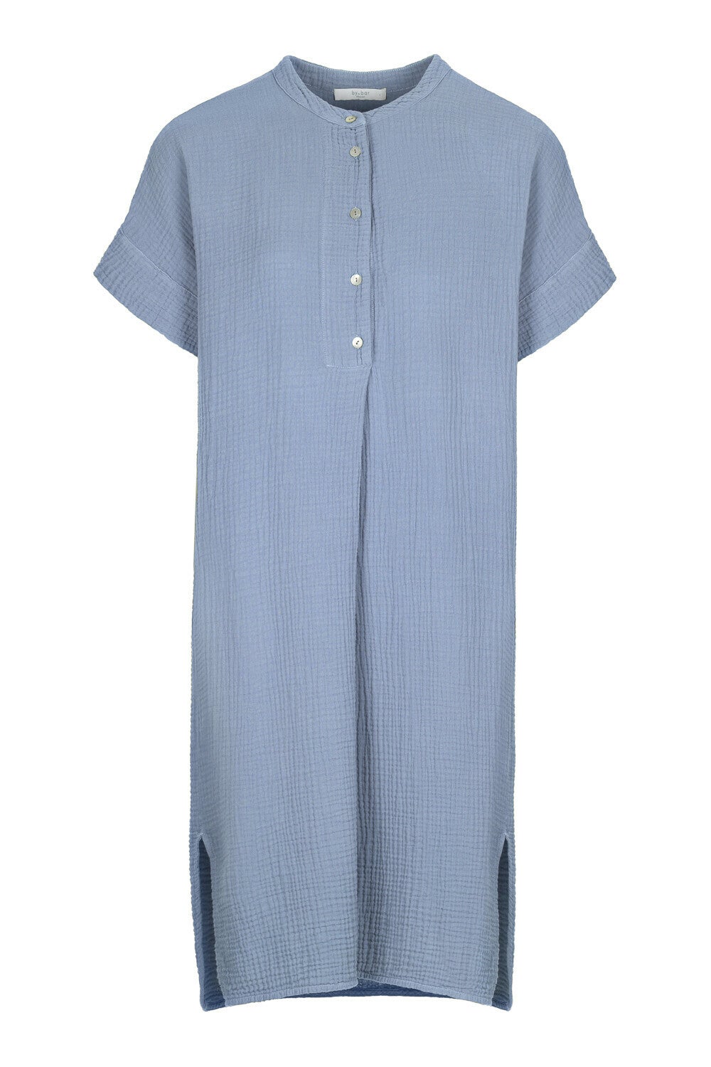 De otty dress is gemaakt van 100% katoen. Deze jurk heeft een ronde hals met een smalle boord en een knoopsluiting aan de voorkant. Verder heeft de jurk heeft een korte mouw. De wafelstructuur van het materiaal geeft de jurk een rijke uitstraling. De achterkant van de jurk is rond, valt wat langer dan de voorkant en is voorzien van een split