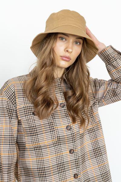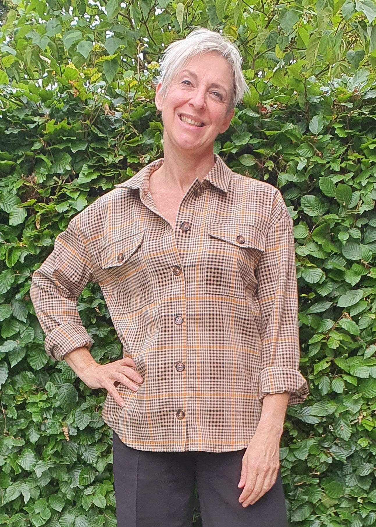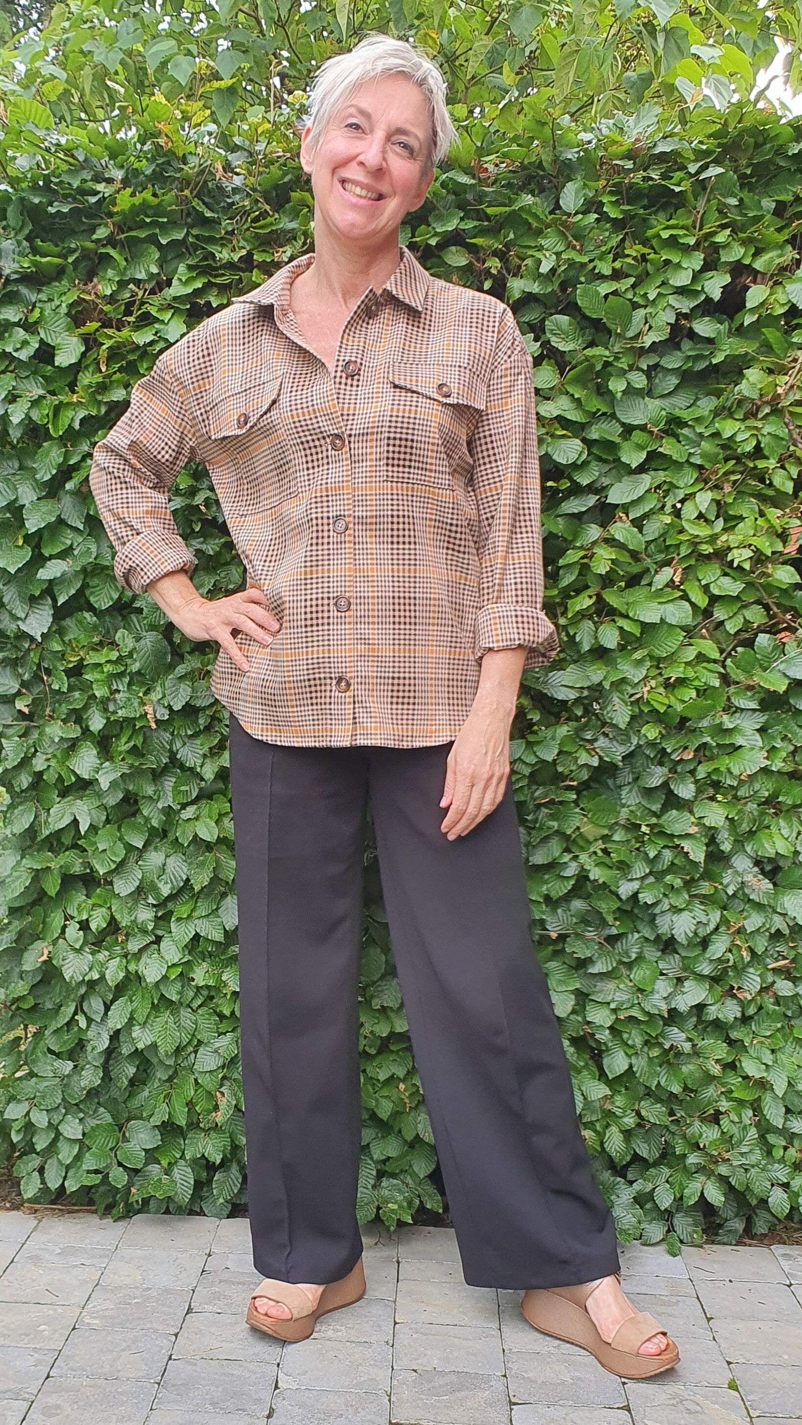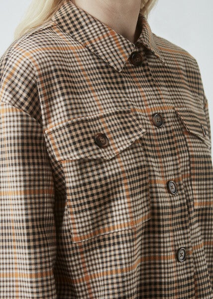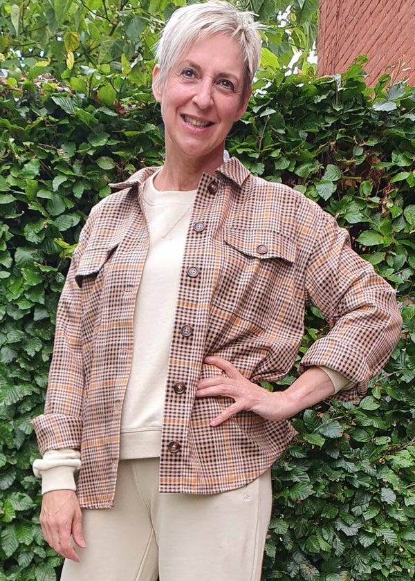 Bruin met oranje geruit overshirt met zakken en knopen. Het shirt kan open over een t-shirt gedragen worden voor een casual look.