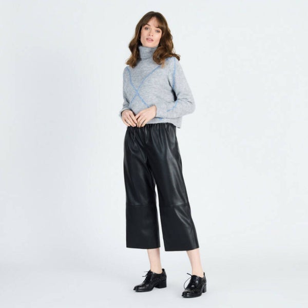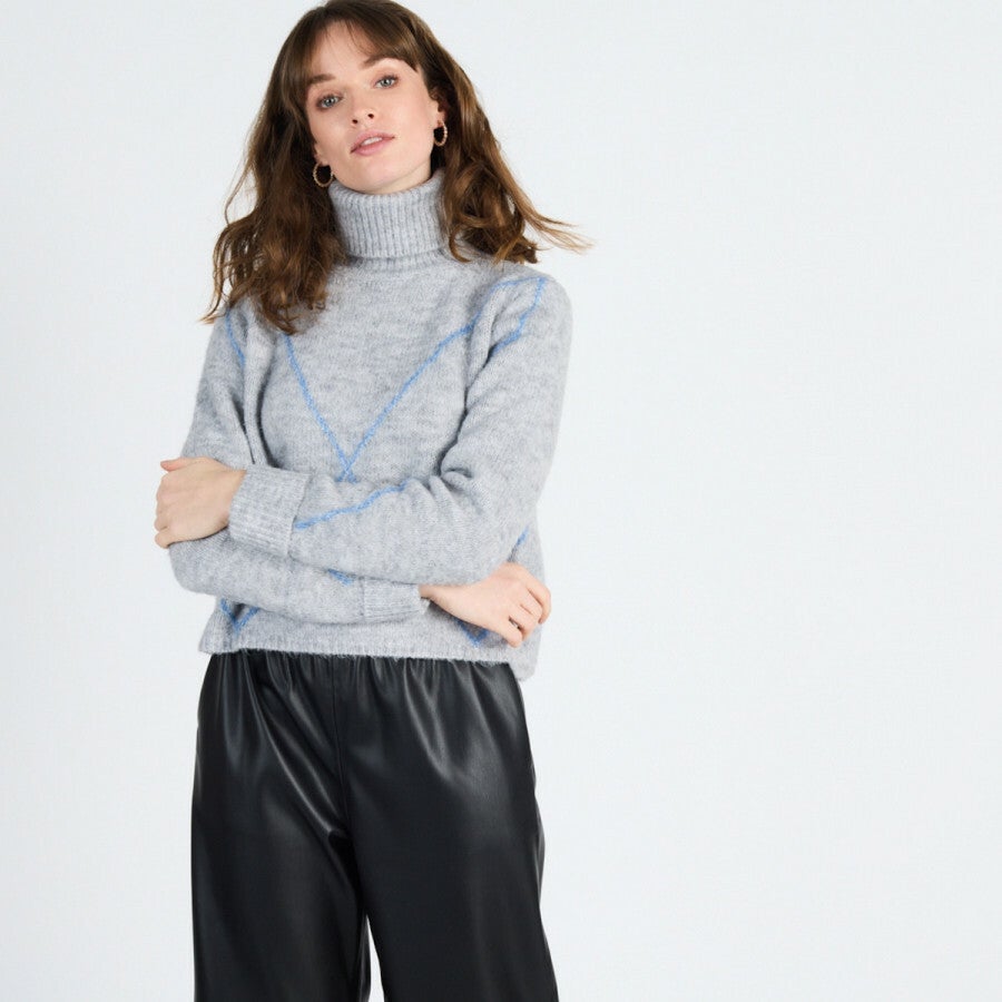 Zachte grijze trui met geometrisch patroon. De trui tailleert normaal