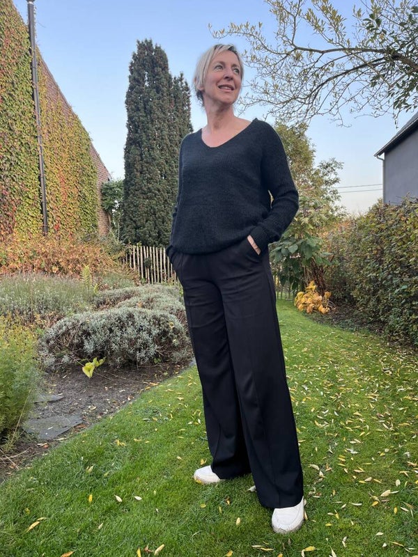 Superzachte trui met lange mouwen en v-hals en mooi gekruist detail op de rug.