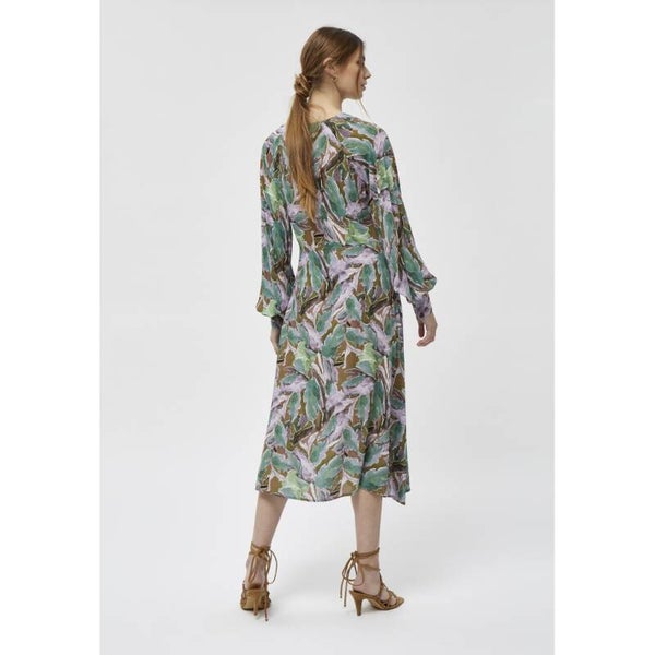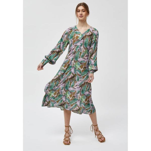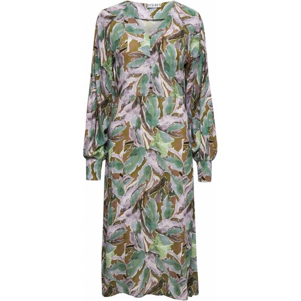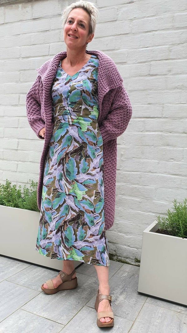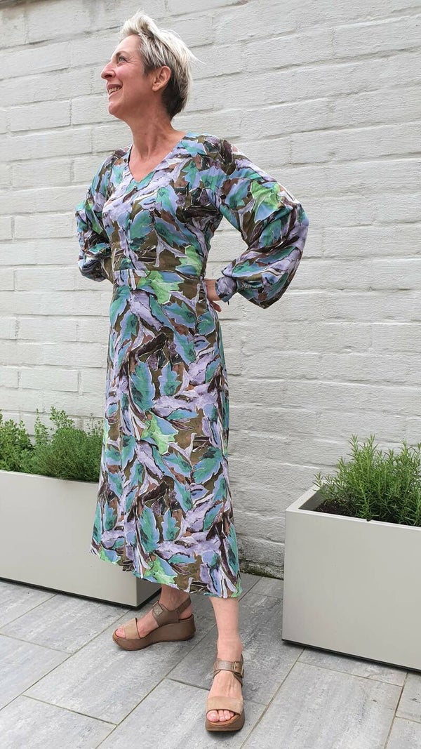 Prachtige jurk met kleine fantasieknoopjes en v-hals. De jurk sluit met een ritssluiting aan de zijkant. Mooi detail zijn de karaktervolle ballonmouwen. Mooi te stylen met laarzen. Quality: 100% Viscose (EcoVero)