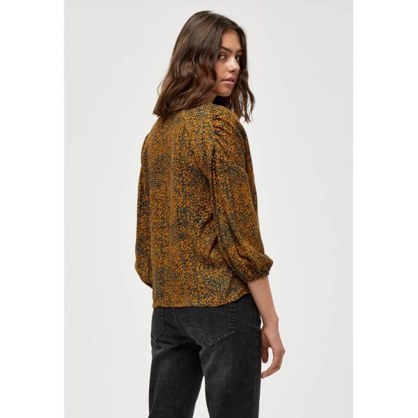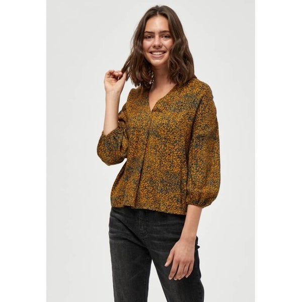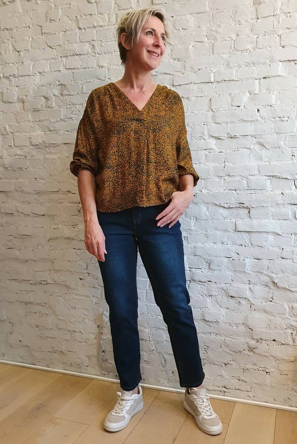blousje met v-hals en 3/4 mouwen in een mooie okergele stof met print.