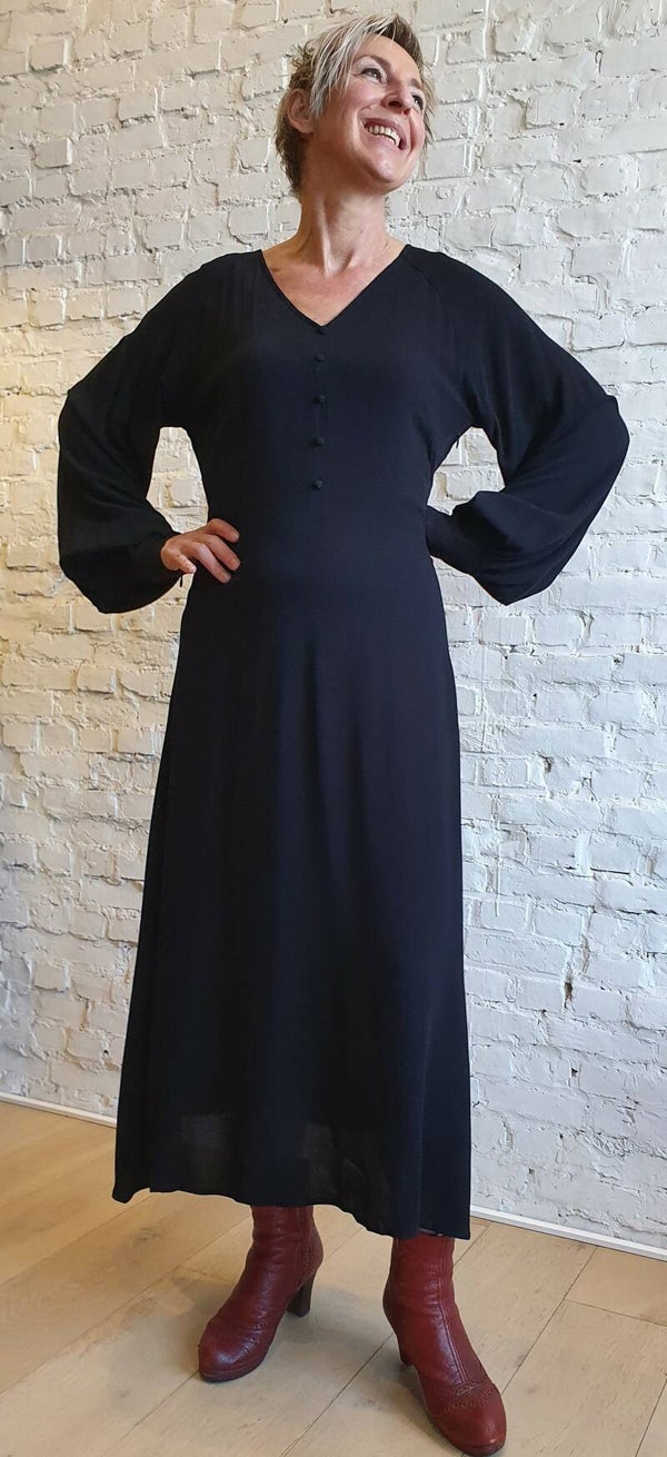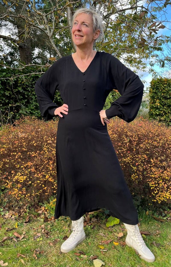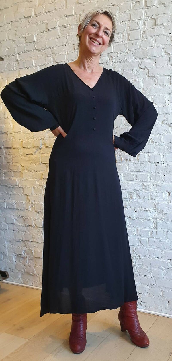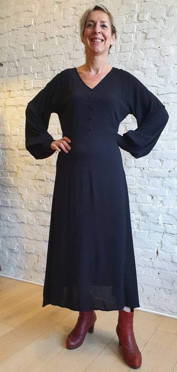 Prachtige jurk met kleine fantasieknoopjes en v-hals. De jurk sluit met een ritssluiting aan de zijkant. Mooi detail zijn de karaktervolle ballonmouwen. Mooi te stylen met laarzen. Quality: 100% Viscose (EcoVero)