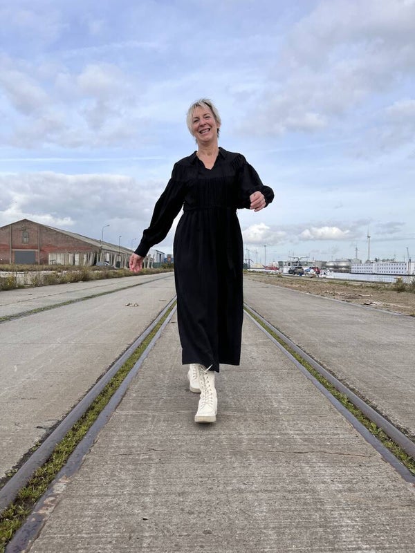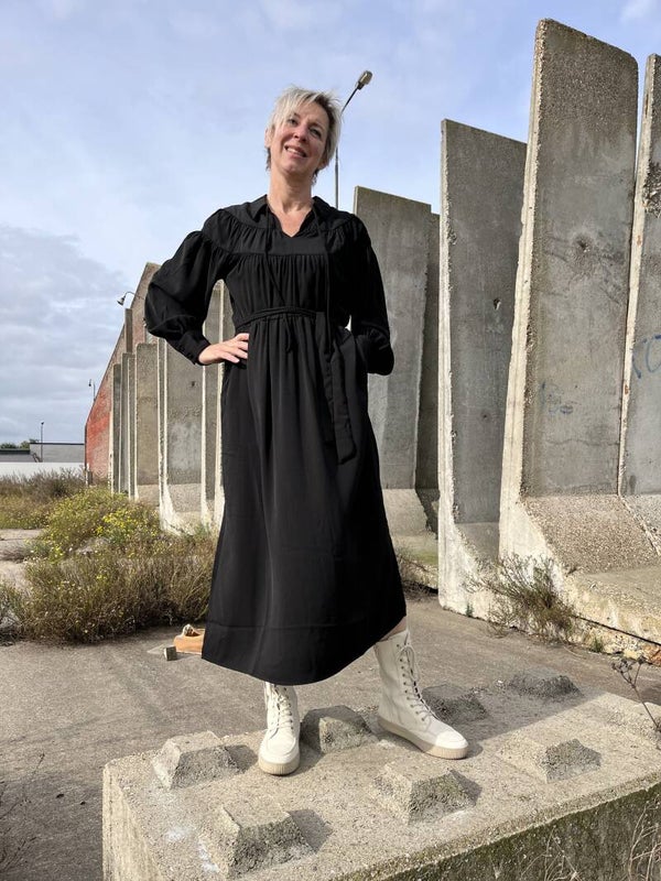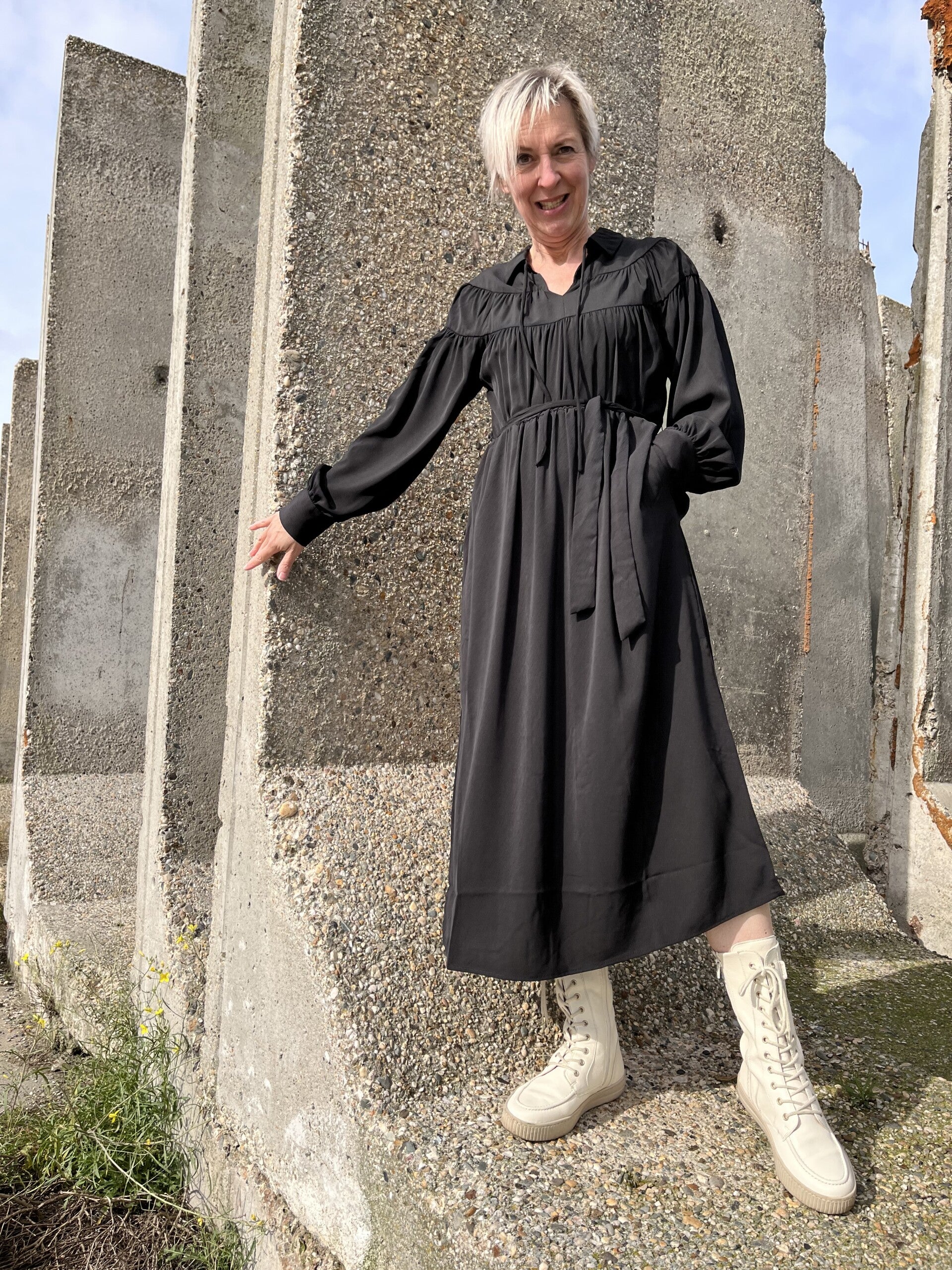 elegante stijlvolle zwarte jurk met lintje in de taille