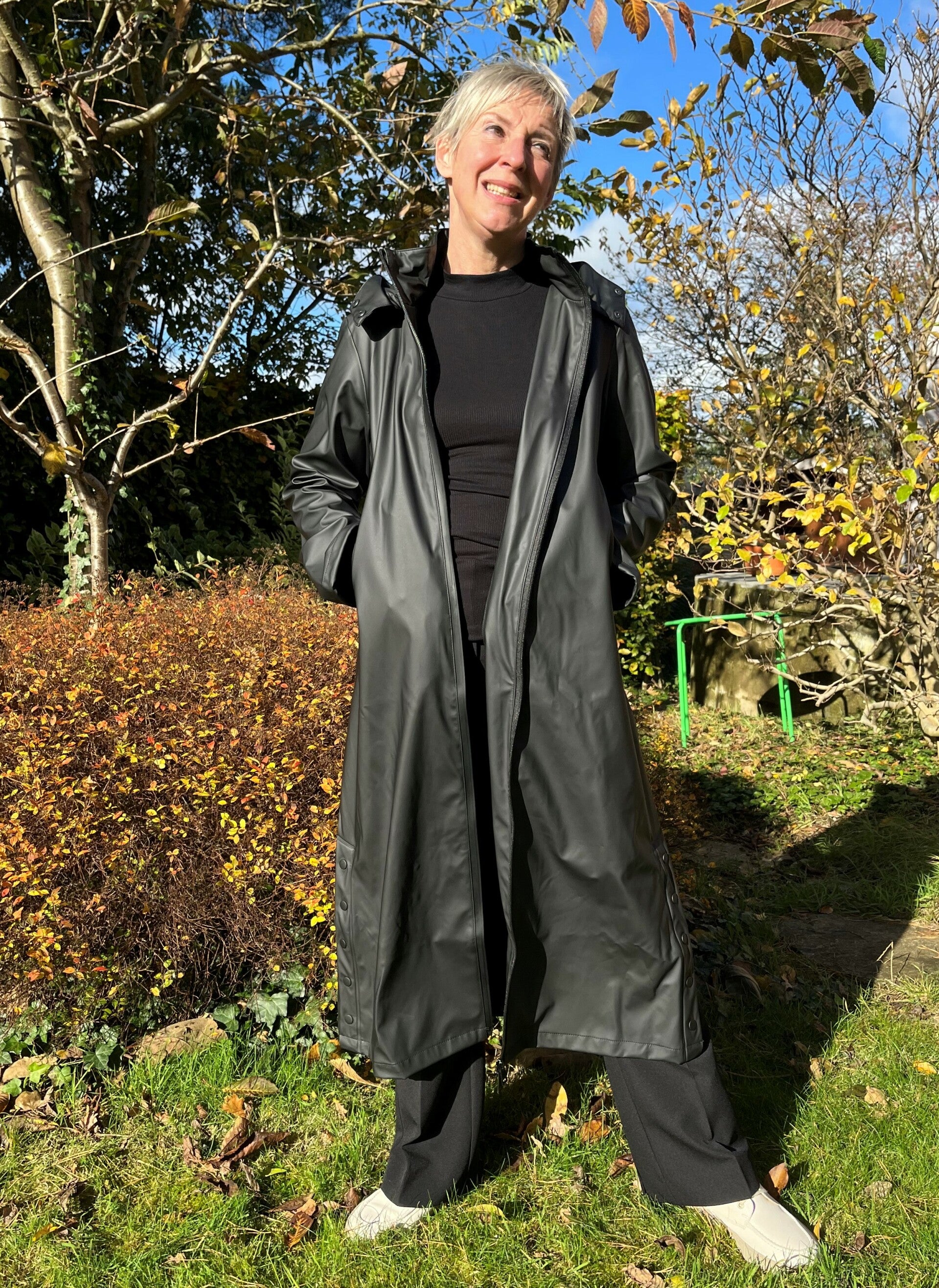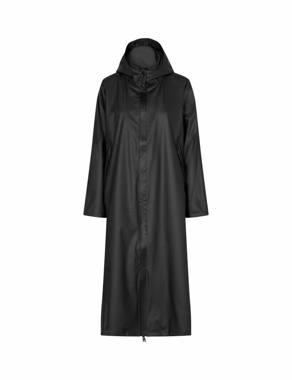 Lange regenjas in ondoorlaatbare stof, met dubbele rits die langs boven zowel als langs onder opengaat. Zijsplitten met drukknopen die je kunt openen om te fietsen. Afneembare kap met drukknopen.