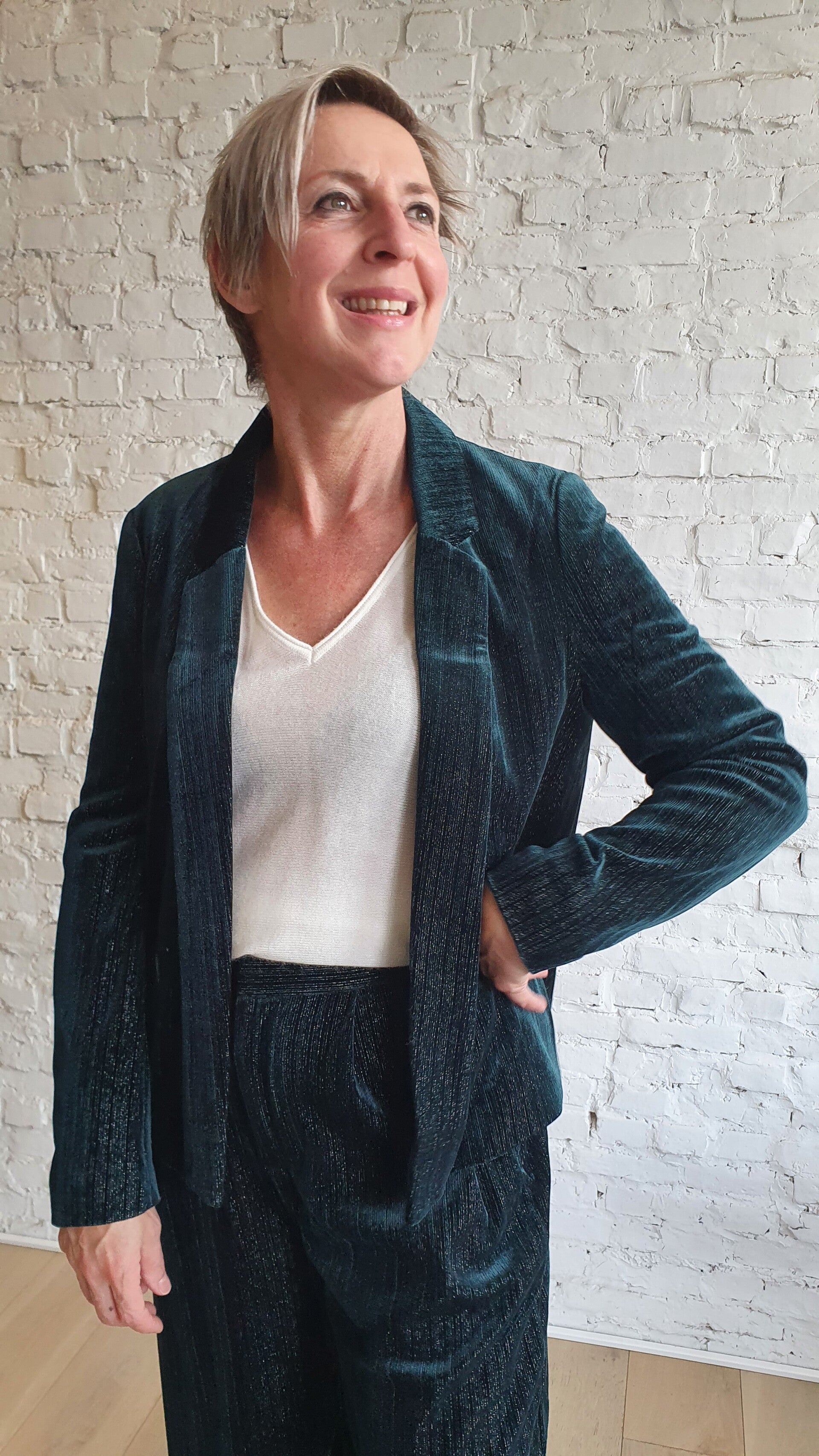 Prachtige groene bkazer in zachte fluweel. Chique met de bijpassende broek maar ook mooi om te combineren met een jeans voor een meer casual