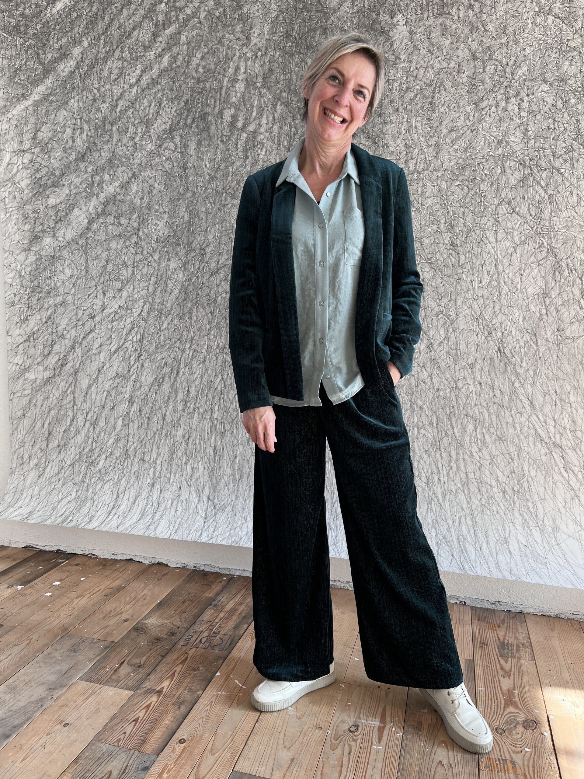 prachtige bottlegroene broek in zacht fluweel. Mooi om te combineren met de bijpassende bazer.