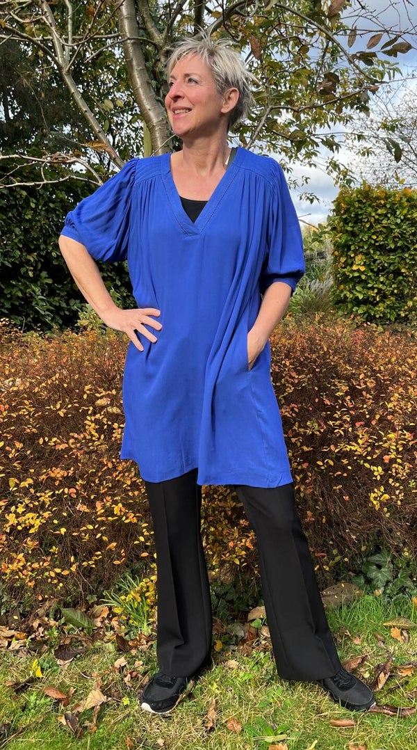 Deze prachtige kobaltblauwe tuniek/jurk met v-hals en korte mouwen valt lekker oversized