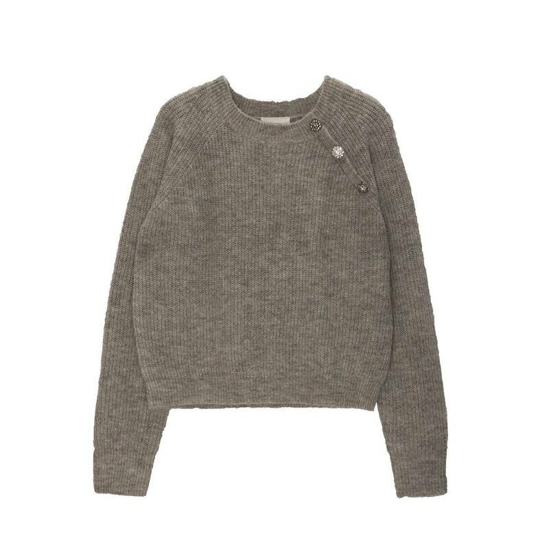 grijsgroene trui met mooie fantasieknopen aan de schouder
