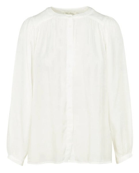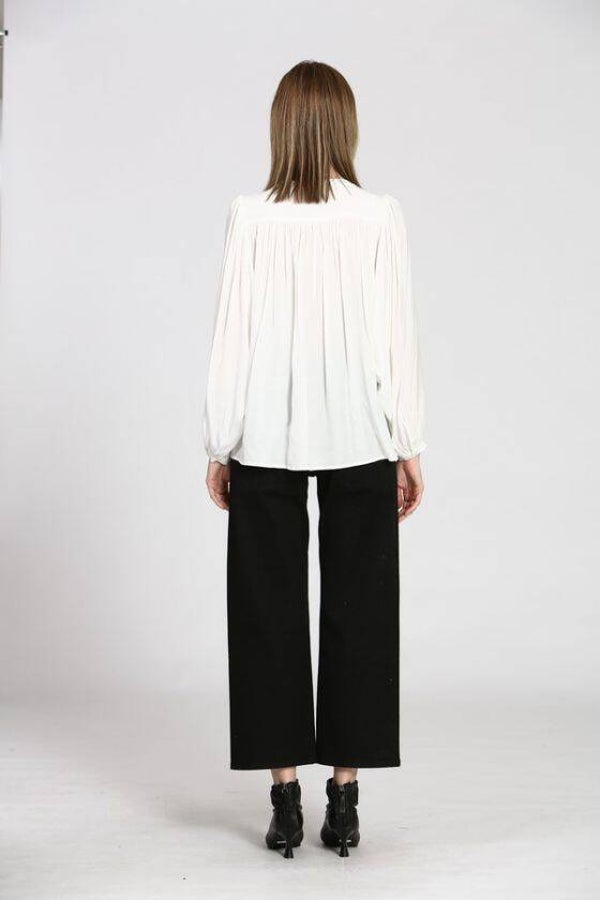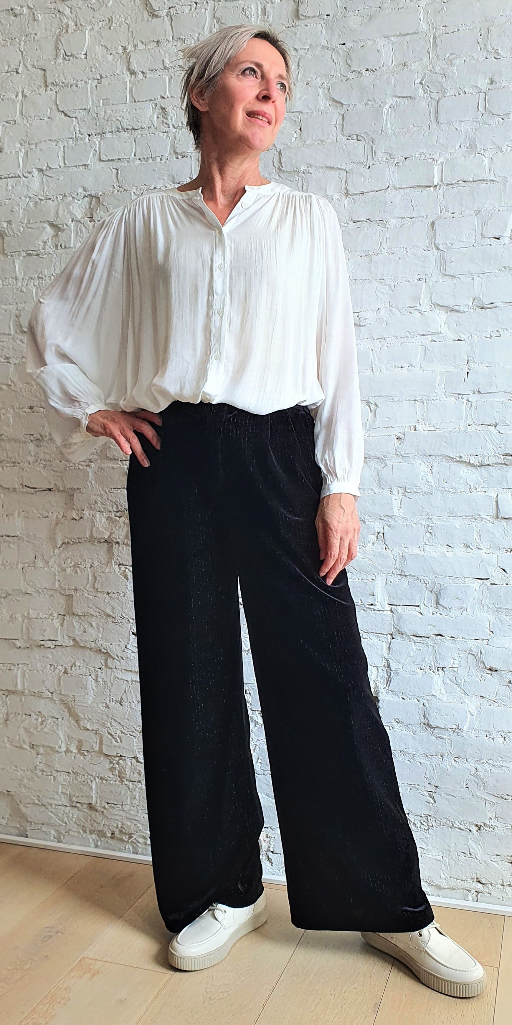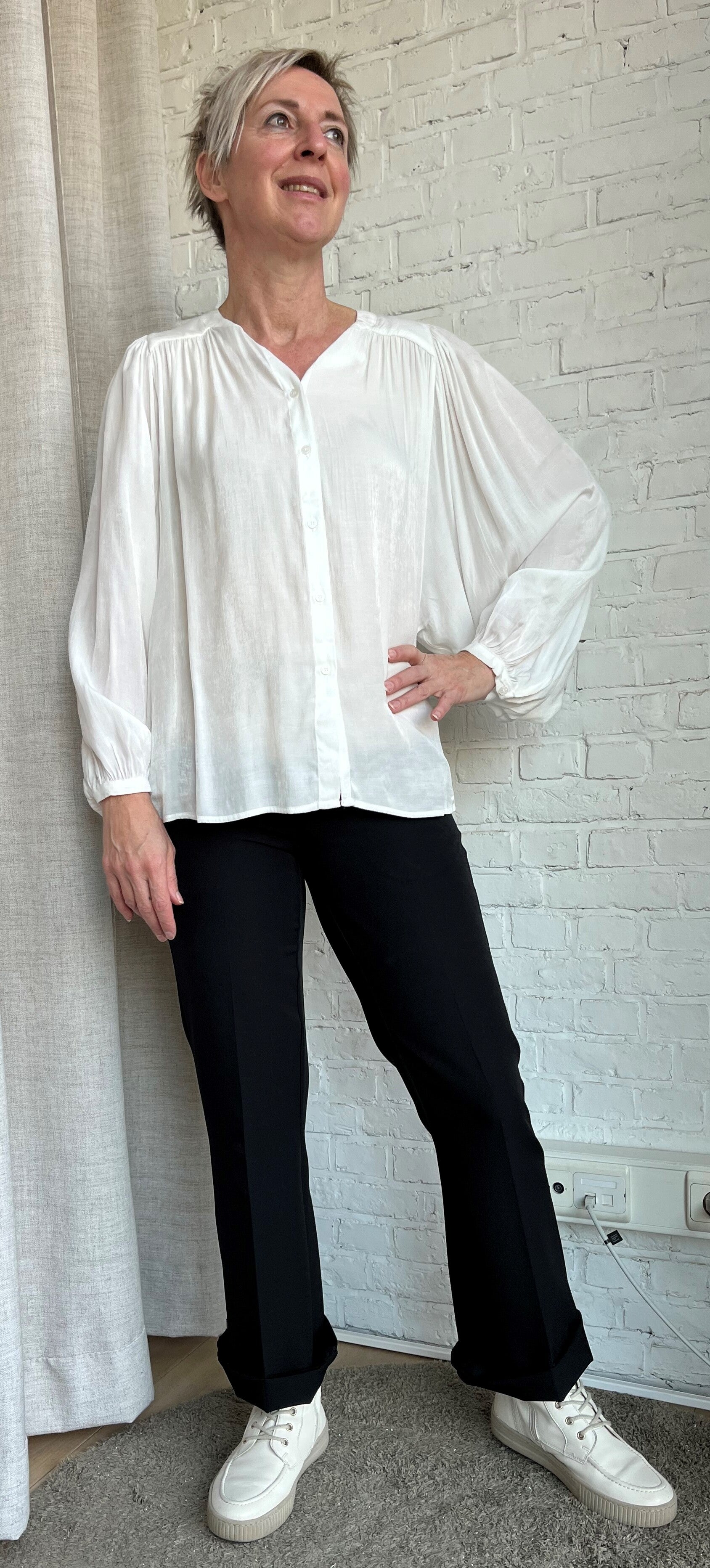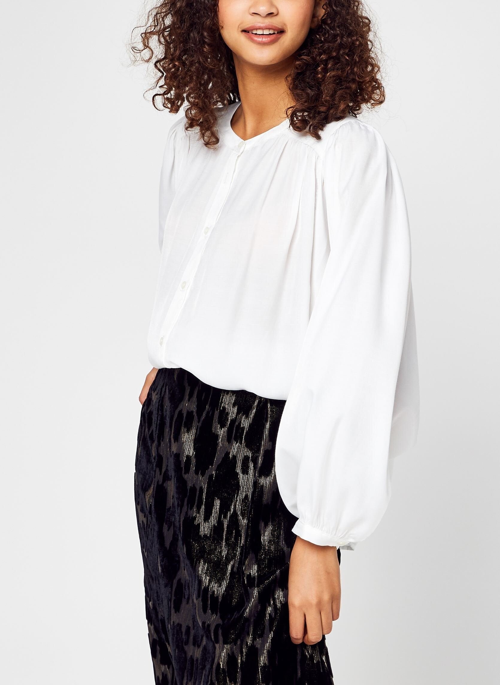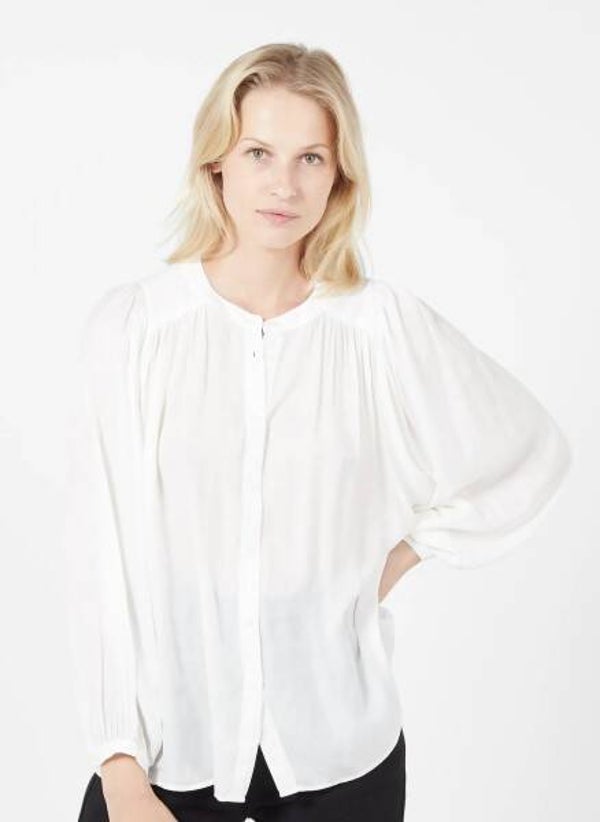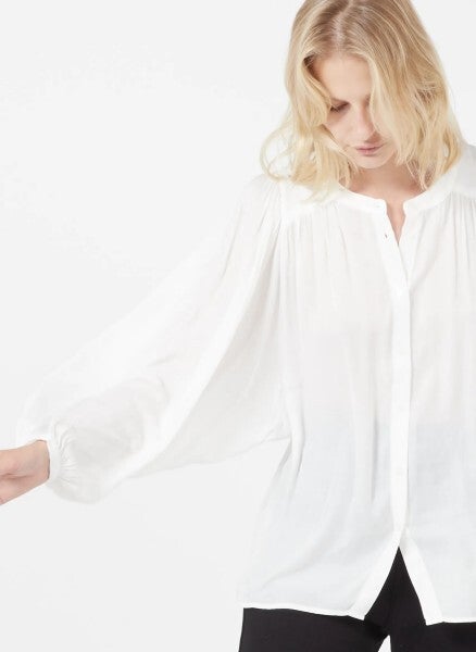de blouse heeft een oversized snit met wijde ballonmouwen en plooitjes op de rug, wat zorgt voor een zeer artistieke uitstraling