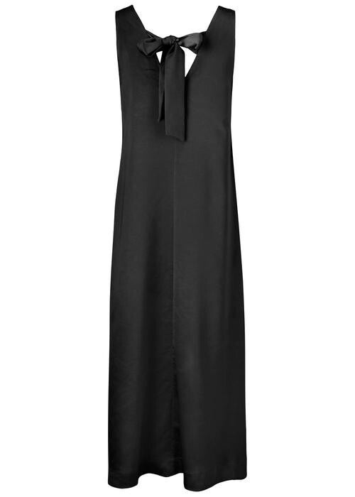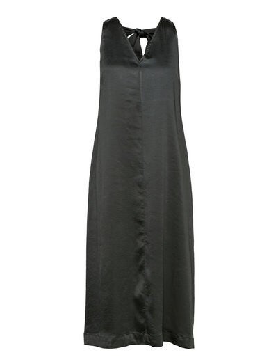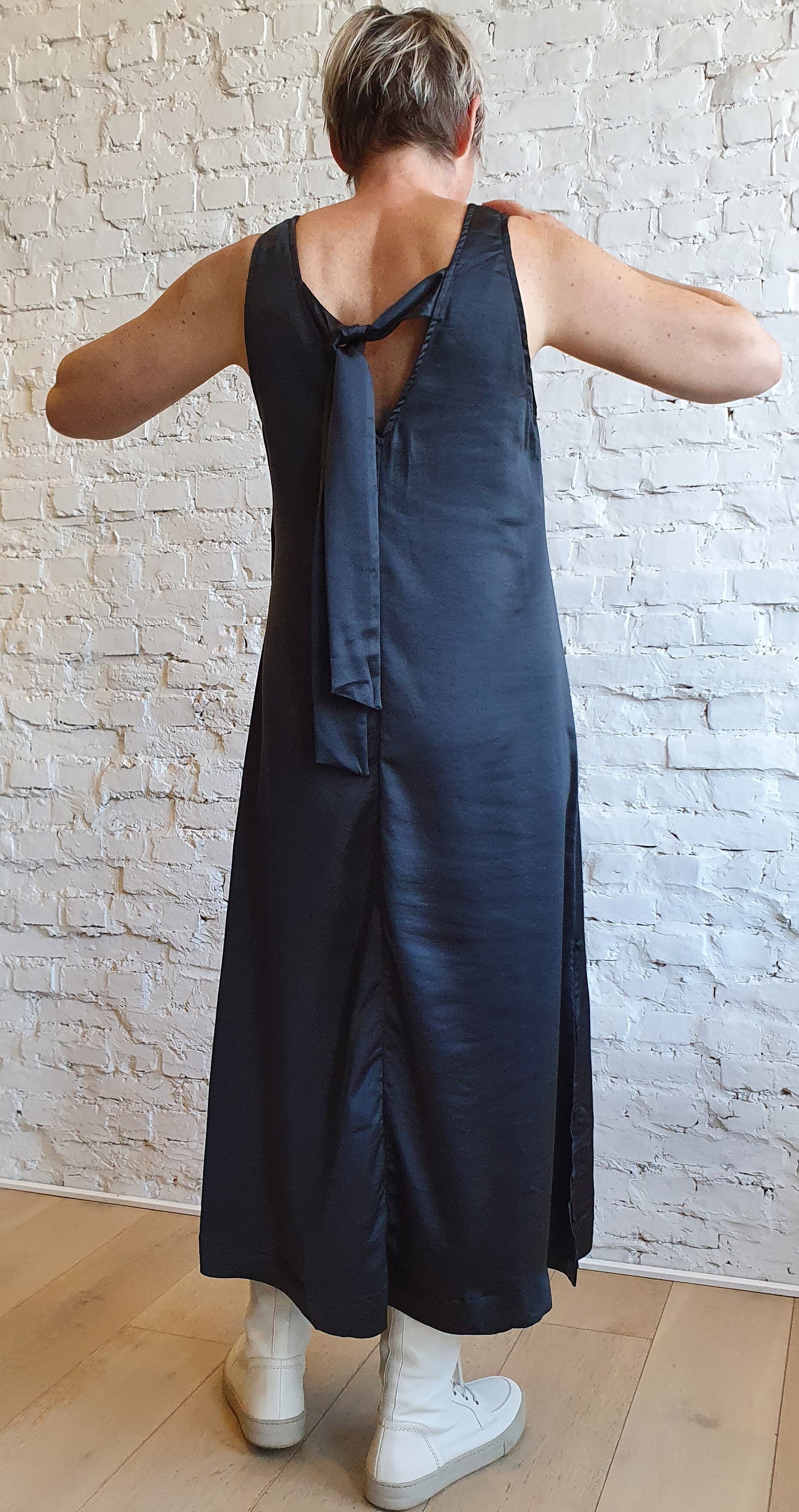 mooie, lange jurk met fijne details. De jurk is mouwloos, heeft een v-hals aan zowel de voor- als achterkant, samen met een lint op de achterkant in hetzelfde prachtige materiaal als de rest van de jurk.