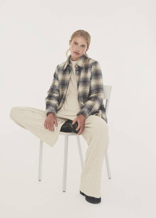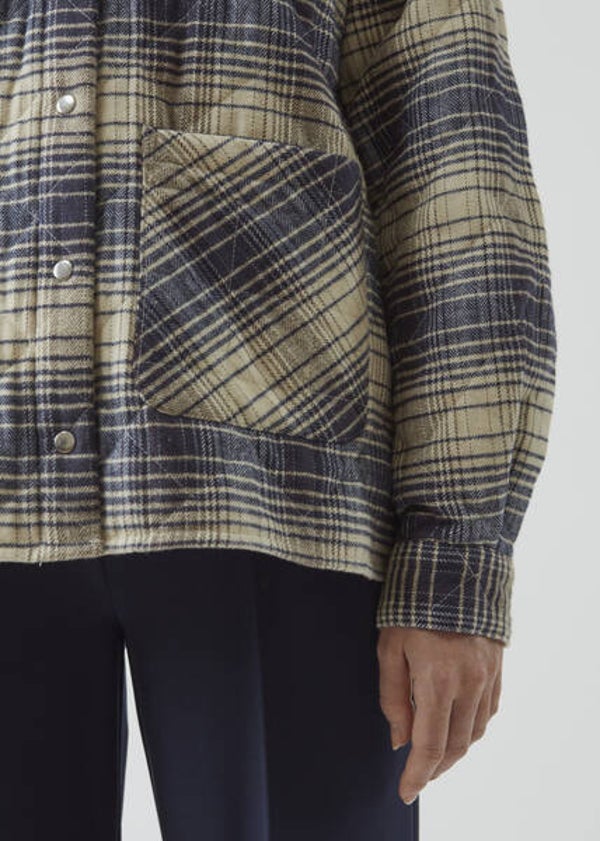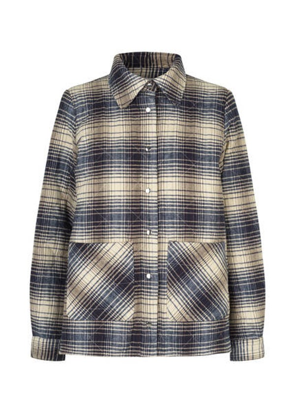 Deze geruite “Coatigan” is licht gewatteerd en uitgevoerd in een zachte kantoen. Het voorpand sluit door middel van drukknopen en heeft grote zakken.