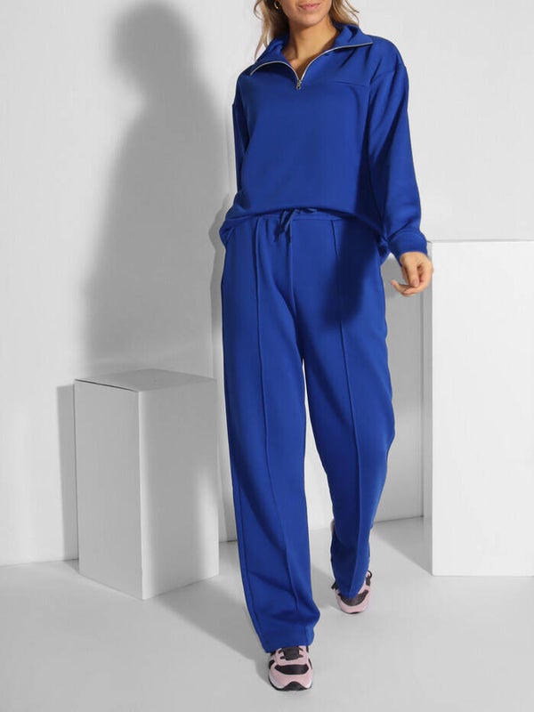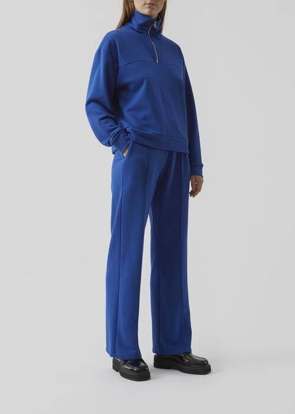 kobaltblauwe broek van biologisch katoen met een losse en relaxte pasvorm. De broek heeft een koordsluiting in de elastische tailleband en een naad aan de voorkant van de pijpen.