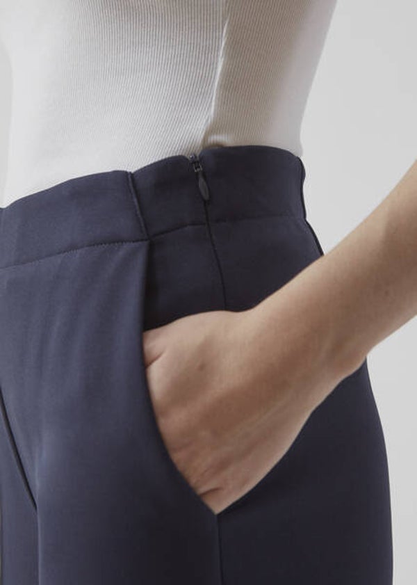 Vlotte blauwe broek met rechte pijpen en rits in zijnaad + elastiek in taille. Zeer comfortabele pasvorm.Het model is 173 cm en draagt maat S/36Materiaal: 92% polyester 8% elastaan